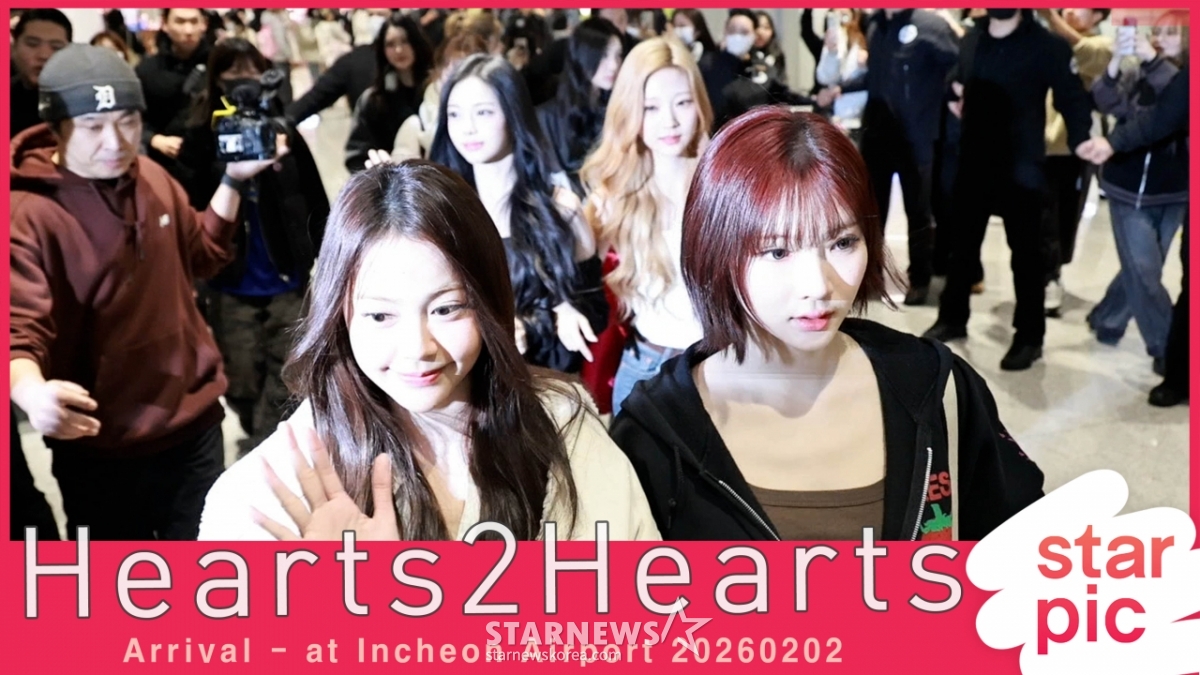 The group Hearts2Hearts Carmen, Jiwoo, Yuha, Stella, Jooeun, Ana, Ian, and Yeon arrive at Incheon International Airport on the afternoon of the 2nd after performing SMTOWN in Japan. 2026.02.02