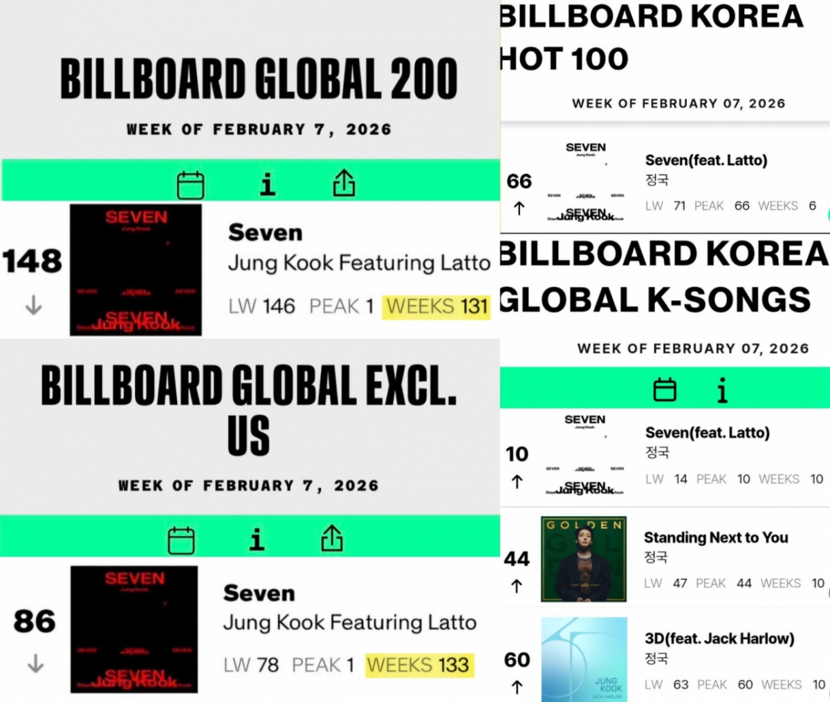 Jungkook's "Seven," "Standing Next to You," and "3D" all topped the "Global 200" and "Global (excluding the U.S.)" charts.