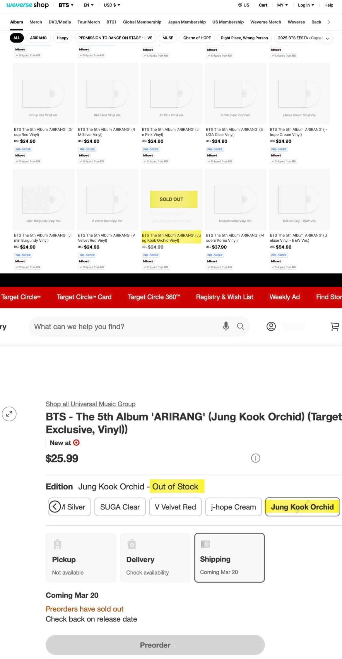 Among the LPs of BTS's fifth studio album "ARIRANG", Jungkook's version of "Orchid" was sold out at Weverse Shop until the second re-orders.