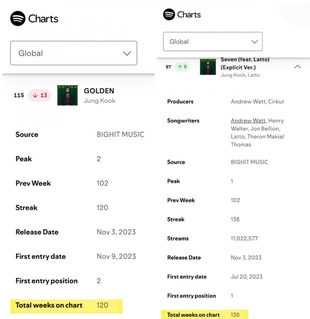 On Spotify, "GOLDEN" has surpassed 6.77 billion cumulative streams among Asian singers' regular albums, and is on the verge of reaching 6.8 billion. "Seven" was also the first Asian singer to reach 2.8 billion streams.