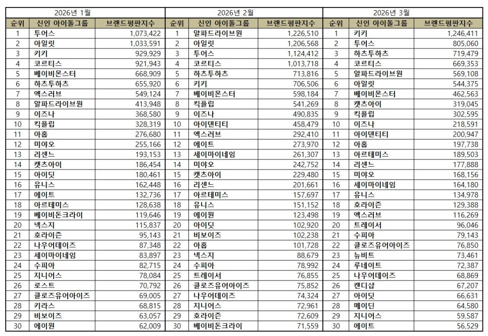 In March 2026, the 30th place in the brand reputation of the new idol group was analyzed in the order of Kiki, Tours, Hearts to Hearts, Cortis, ALPHADRIVEONE, ILLIT, Baby Monster, Cats-Eye, Kick Flip, Izuna, Identity, 9, Artemis, Lisene, Miyao, Say My Name, Eunice, Horizon, X-Love, Tracer, Supia, Close Your Eyes, Newbit, Lunate, Nowardays, Candy Shop, Idit, Madein, Genius, and Eight.