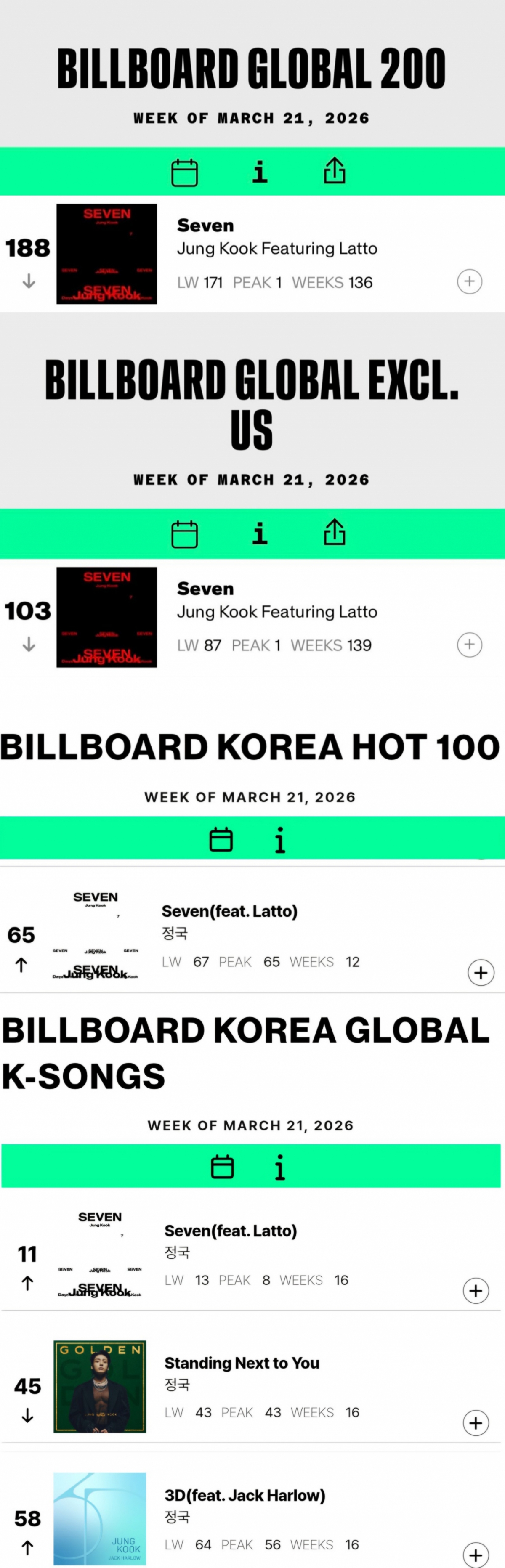 Jungkook topped both Billboard's "Global 200" and "Global (excluding the U.S.)" charts with his three songs "Seven," "Standing Next To You," and "3D." "Seven" also debuted at No. 1 on the Billboard main single chart "Hot 100," and the other two songs ranked fifth each, making all three top five.