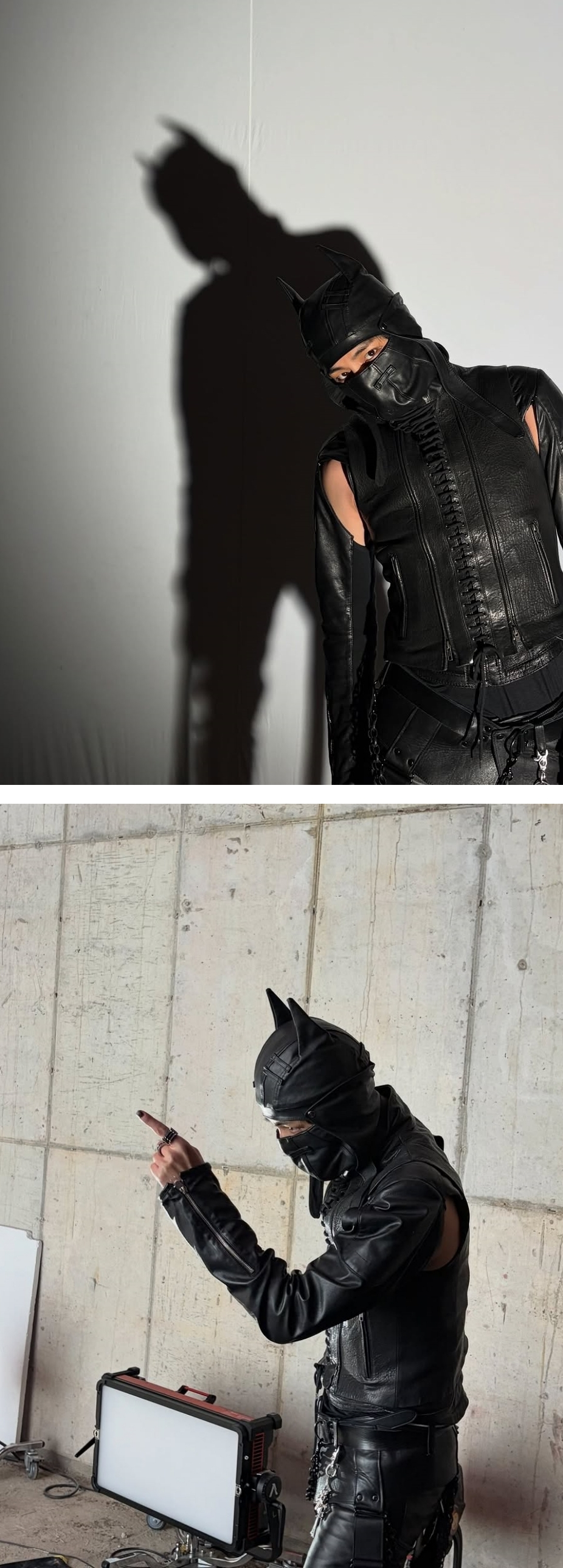 V wore a black leather costume covering his whole body and a leather mask reminiscent of Batman, creating a dreamy atmosphere like a scene in a movie, and exuded intense charisma.