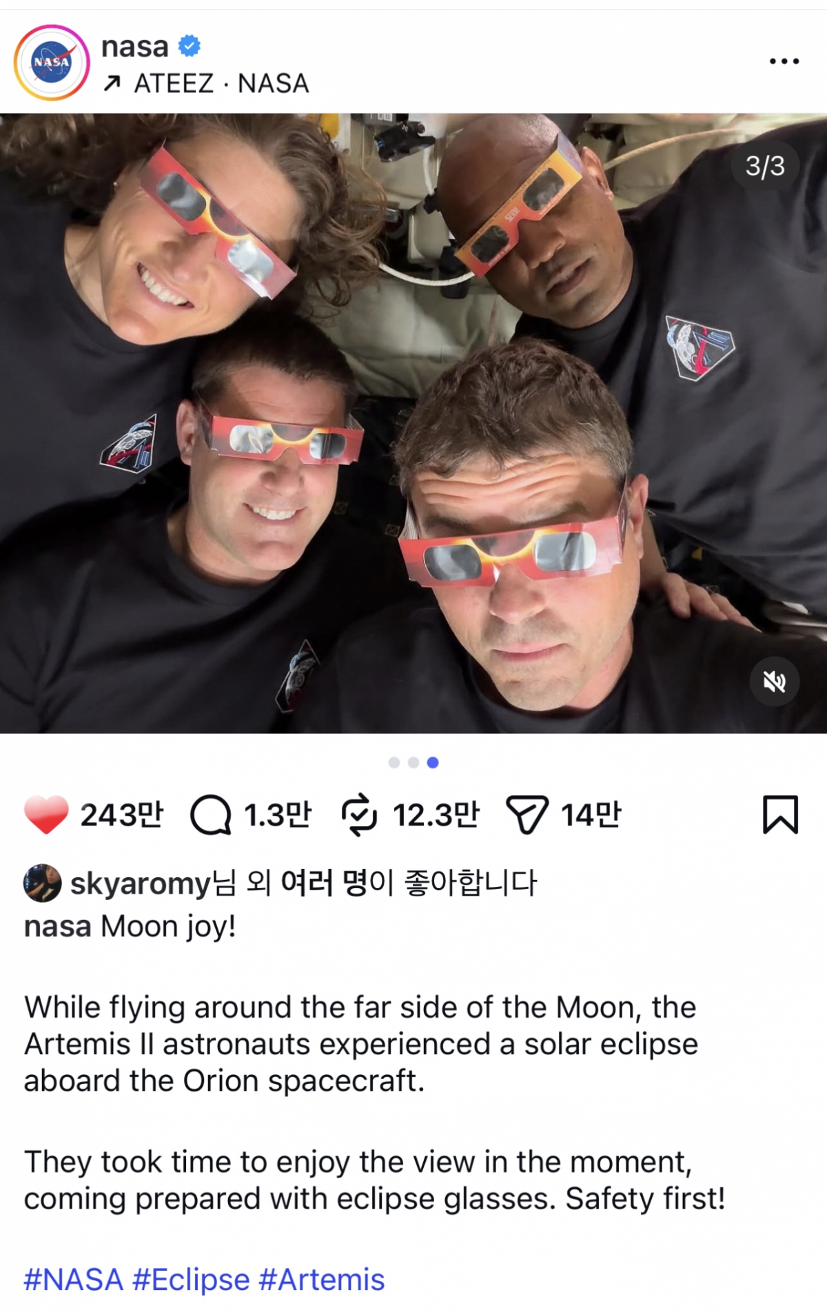 Recently, NASA of the U.S. space agency set ATEEZ 'NASA' as the background music in a post related to Artemis 2. Launched from the Kennedy Space Center on April 1, 2026, Artemis II aims to return to Earth in a free return orbit around the moon, carrying NASA astronauts Reed Wiseman, Victor Glover, and Christina Cork for 10 days. It is the second flight of the Space Launch System (SLS) and the first manned flight of the Orion spacecraft, and the first manned mission beyond low-Earth orbit since Apollo 17 in 1972.