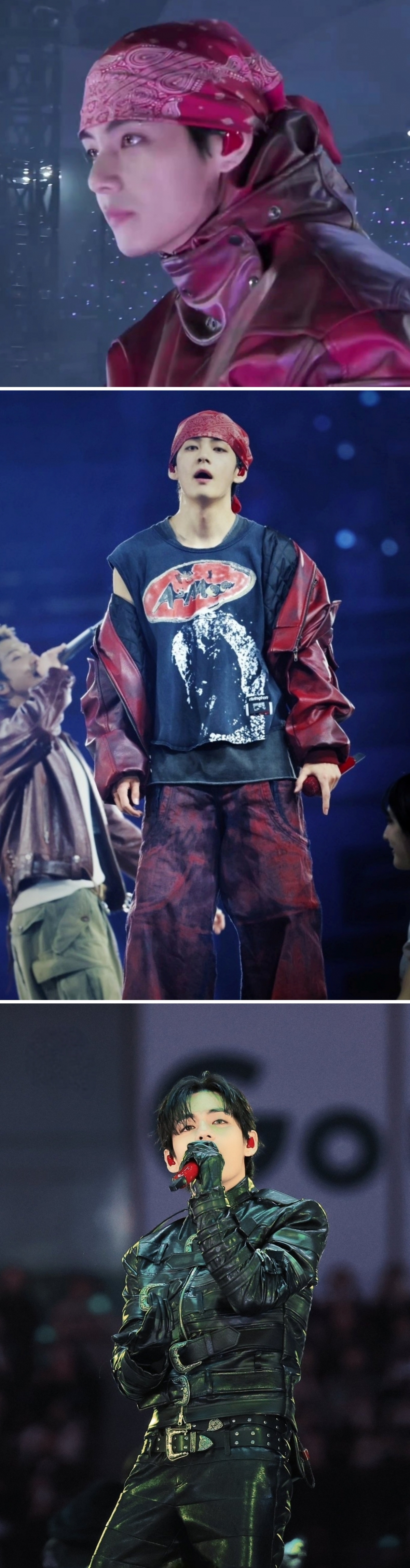 V showed excitement with a fresh boyish look like a newly debuted fifth-generation idol in his appearance with short black hair covering his forehead, and he showed strong charisma in clothes wrapped all over his body in black leather. Wearing a headscarf and piercing eyebrows transformed into a noir villain himself, providing visual pleasure in various forms. As the most handsome man in the world, when V's appearance appeared on the screen for a while, the cheers of fans who admired his beautiful face filled the concert hall as if it were leaving.