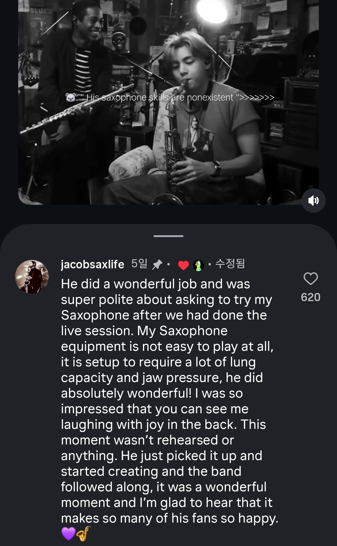 Recently, Jacob Skesny left a comment on a video of V's saxophone performance posted by a fan. He said, "V played really well, and after the live session, I asked very politely if I could try playing my saxophone. My saxophone is actually very difficult to play. It was set up to require a lot of lung capacity and to give a lot of pressure on the jaw. And yet he played amazingly well!"