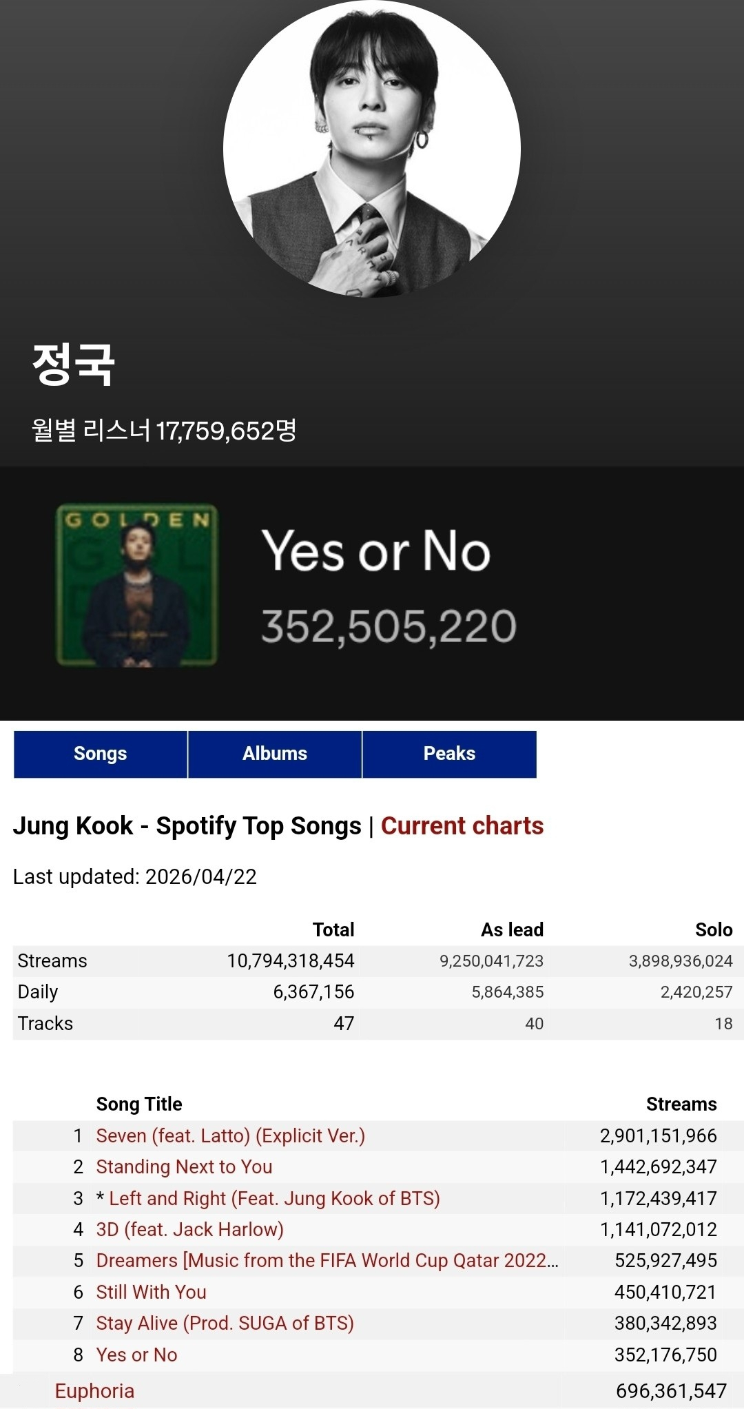 "Yes or No" is the 8th song on Jung-kook's personal Spotify account (profile) to reach 350 million streams (Seven, Standing Next to You, Left and Right, 3D, Dreamers, Still With You, Stay Alive, Yes or No). This marks the 4th track from the "GOLDEN" album to reach 350 million streams. With the addition of the solo song "Euphoria" from BTS albums, Jung-kook now holds 9 songs with over 350 million streams on Spotify, showcasing his status as a "world-class super pop star." Jung-kook is also shining as an incomparable hit icon, having broken through 2.9 billion streams with "Seven," the first Asian artist's song to achieve such a milestone.