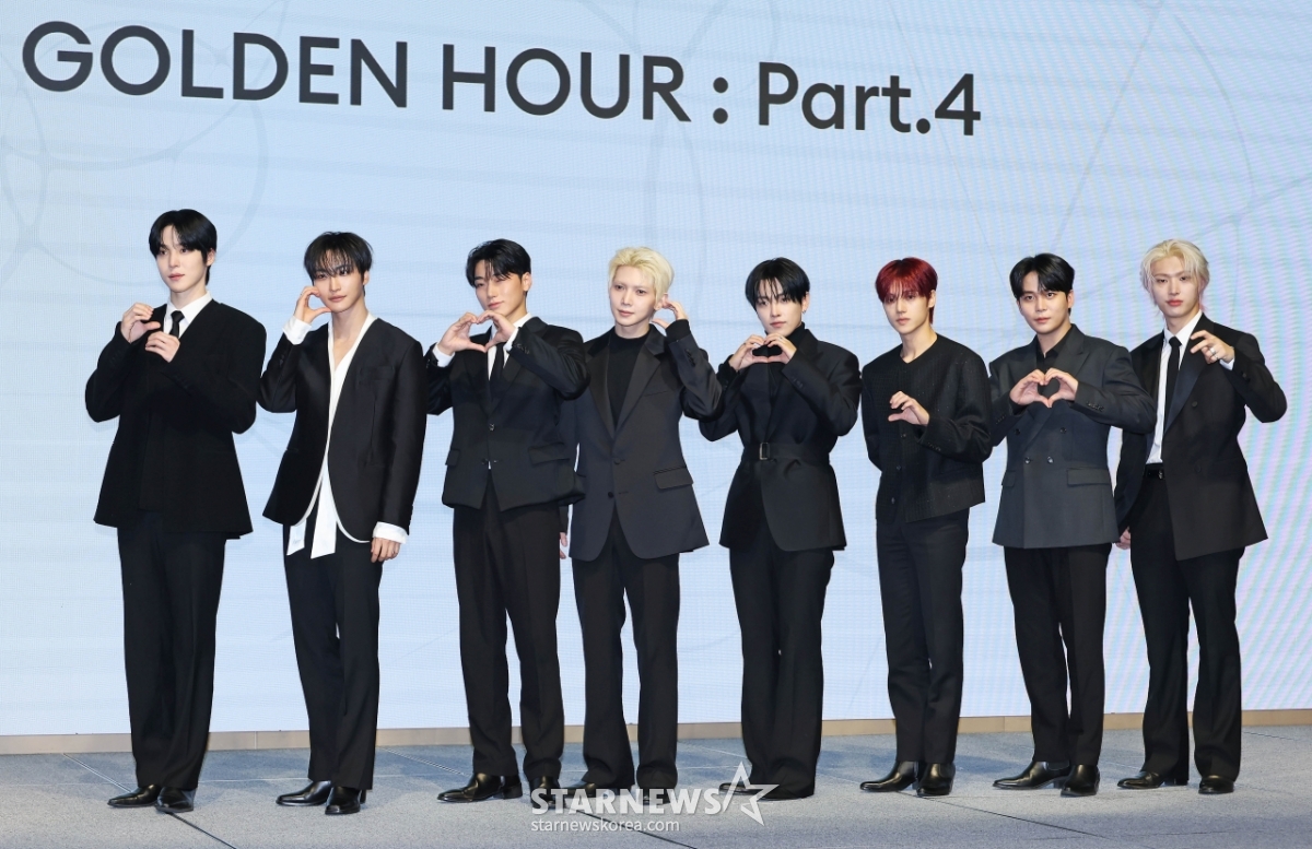 The group ATEEZ poses ahead of a press conference to commemorate the release of its 13th mini album "Golden Hour: Part 4" (GOLDEN HOUR: Part.4) at Fairmont Ambassador Hotel in Yeouido, Seoul, on the afternoon of the 5th. /2026.02.05