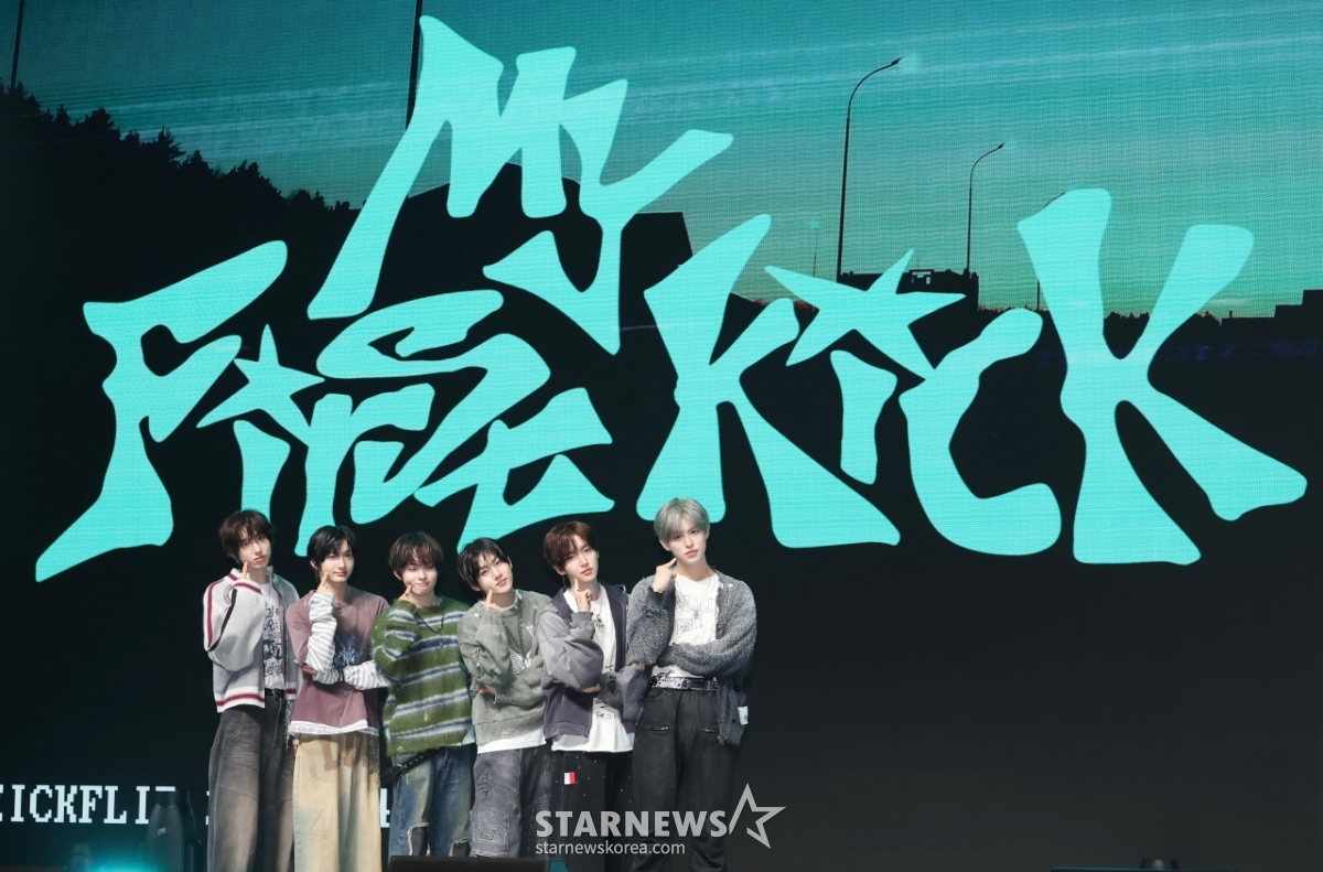 The group KickFlip poses at a showcase commemorating the release of its fourth mini-album "My First Kick" at Yes24 Live Hall in Gwangjin-gu, Seoul, on the afternoon of the 6th.