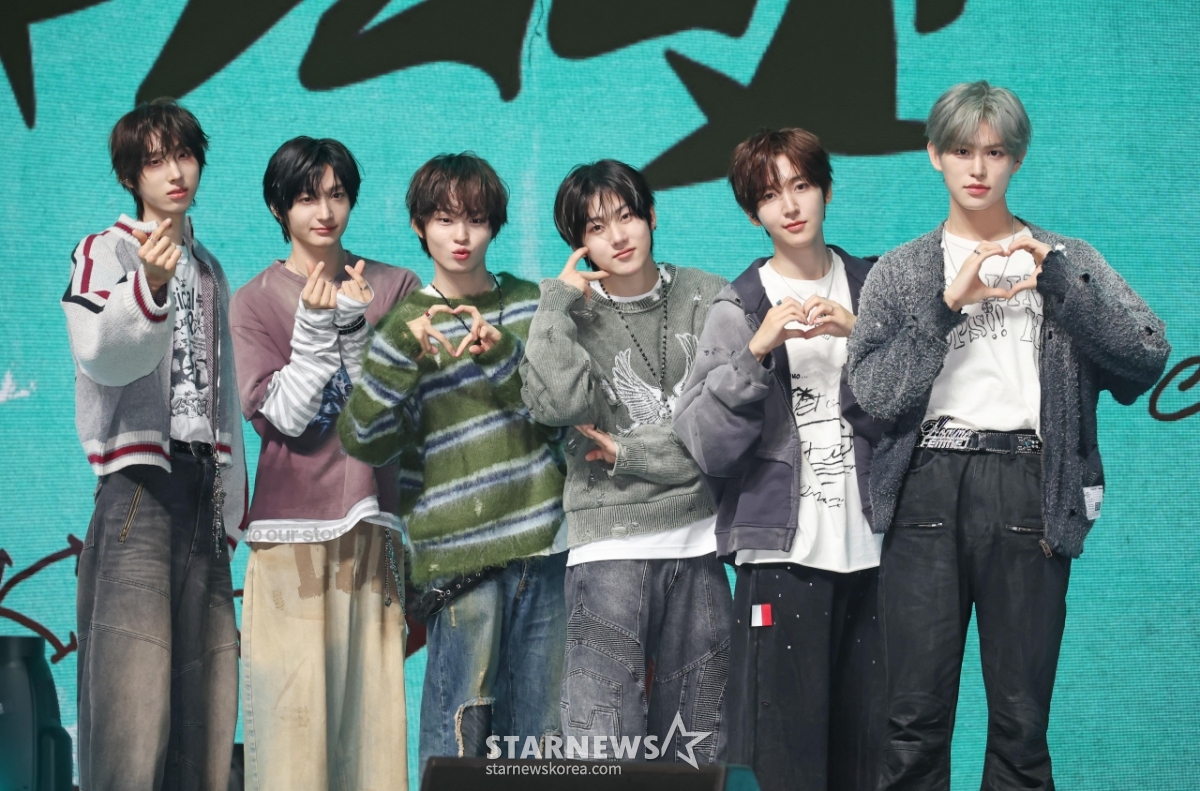The group KickFlip poses at a showcase commemorating the release of its fourth mini-album "My First Kick" at Yes24 Live Hall in Gwangjin-gu, Seoul, on the afternoon of the 6th.