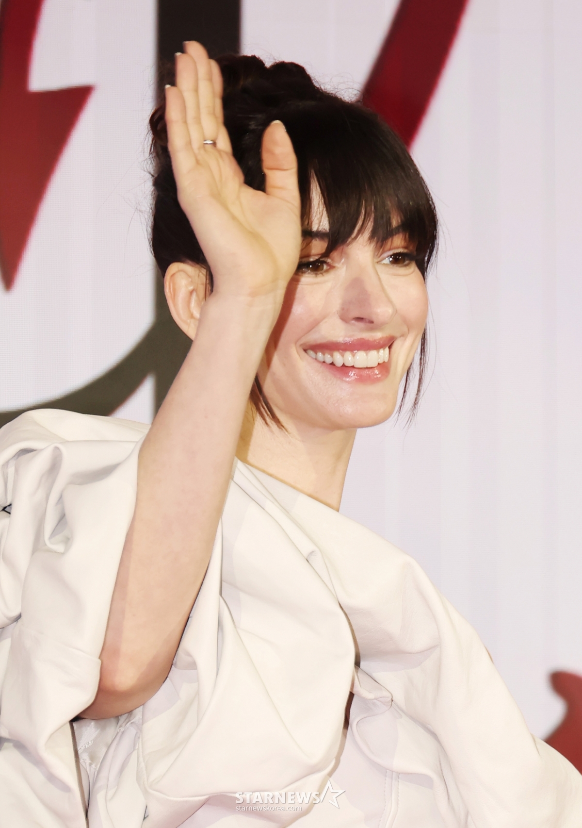 Actress Anne Hathaway will wear Prada, the movie 'The Devil Wears Prada' at the Four Seasons Hotel in Jongno-gu, Seoul on the morning of the 8th 2' Attending a press conference in Korea and posing.