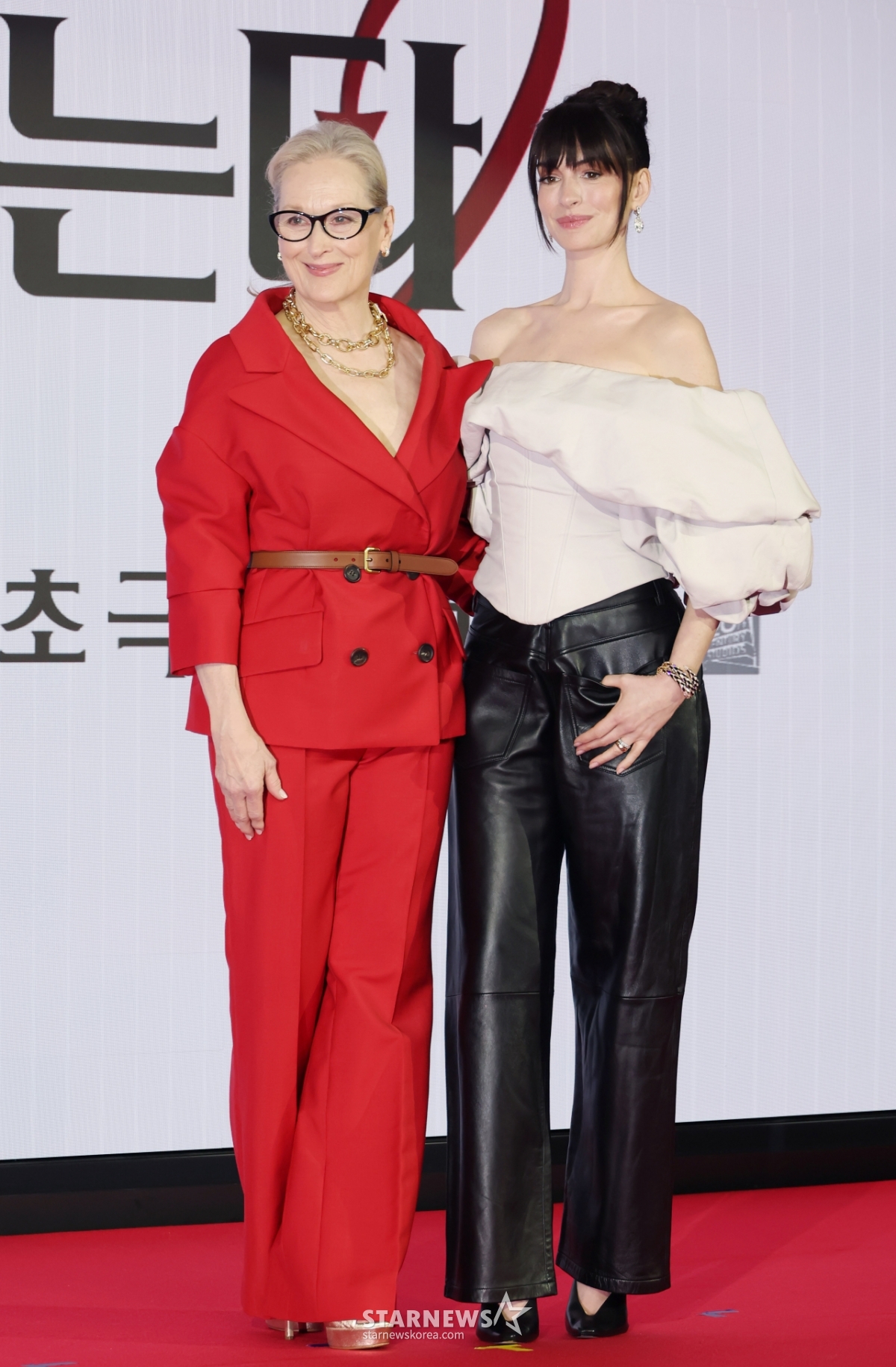 Actress Meryl Streep and Anne Hathaway will wear Prada in the movie 'The Devil Wears Prada' at the Four Seasons Hotel in Jongno-gu, Seoul on the morning of the 8th 2' Attending a press conference in Korea and posing.