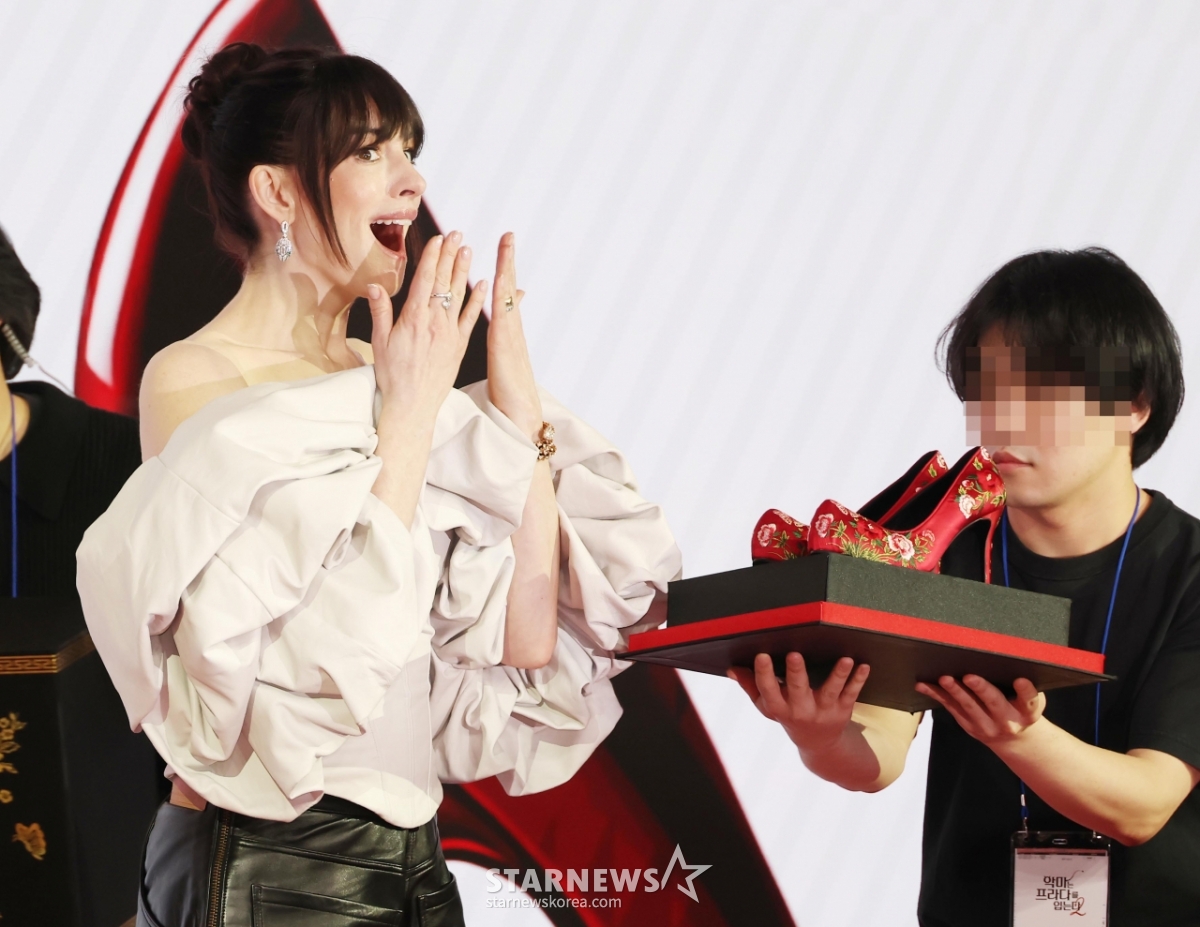 Actress Anne Hathaway will wear Prada, the movie 'The Devil Wears Prada' at the Four Seasons Hotel in Jongno-gu, Seoul on the morning of the 8th He is delighted after receiving high heels with a Korean design at a press conference in Korea.