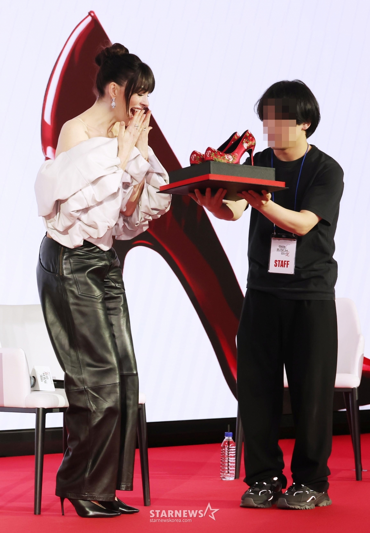 Actress Anne Hathaway will wear Prada, the movie 'The Devil Wears Prada' at the Four Seasons Hotel in Jongno-gu, Seoul on the morning of the 8th He is delighted after receiving high heels with a Korean design at a press conference in Korea.