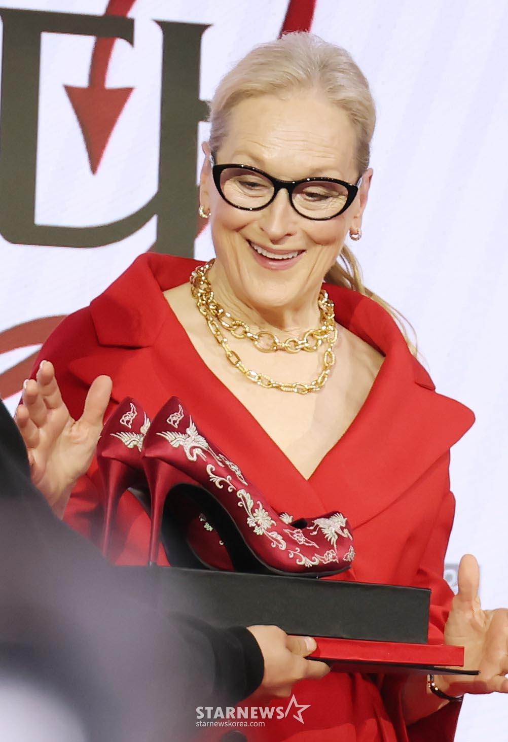 Actor Meryl Streep will wear Prada in the movie 'The Devil Wears Prada' at the Four Seasons Hotel in Jongno-gu, Seoul on the morning of the 8th He is delighted after receiving high heels with a Korean design at a press conference in Korea.