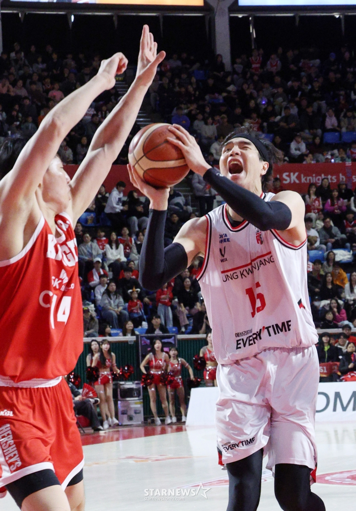 Jeong Kwan-jang Kim Jong-kyu is trying to shoot under the basket past SK Choi Boo-kyung.