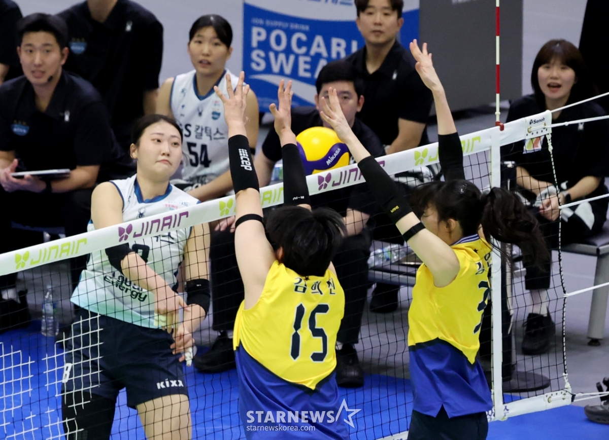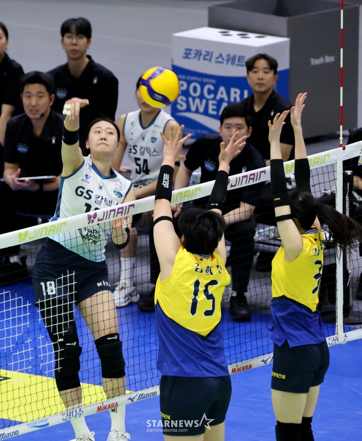 GS Kwon Min-ji is trying to hit Hyundai double blocking in the women's 2025-2026 Jin Air V-League match between Hyundai Engineering & Construction and GS Caltex at Suwon Gymnasium on the 3rd. 2026.01.03.
