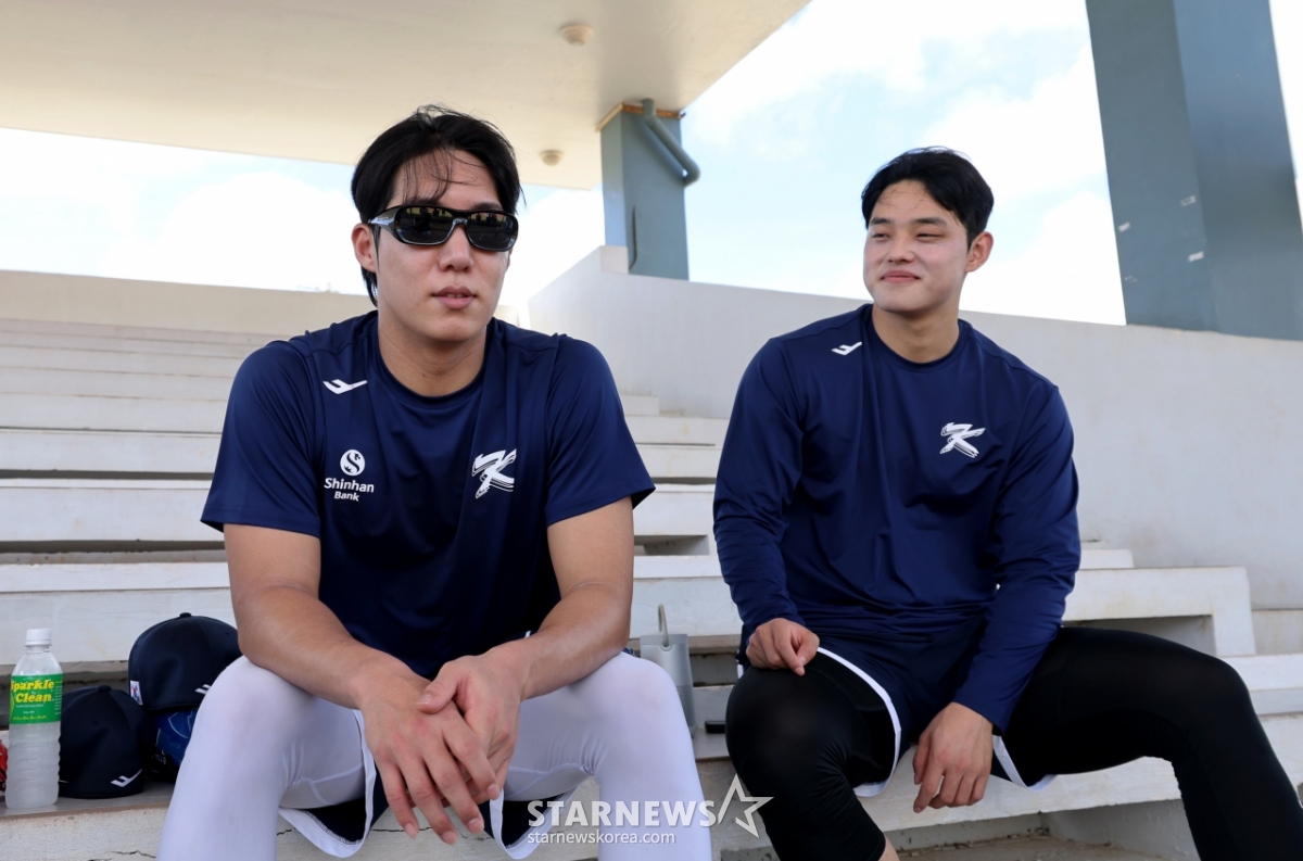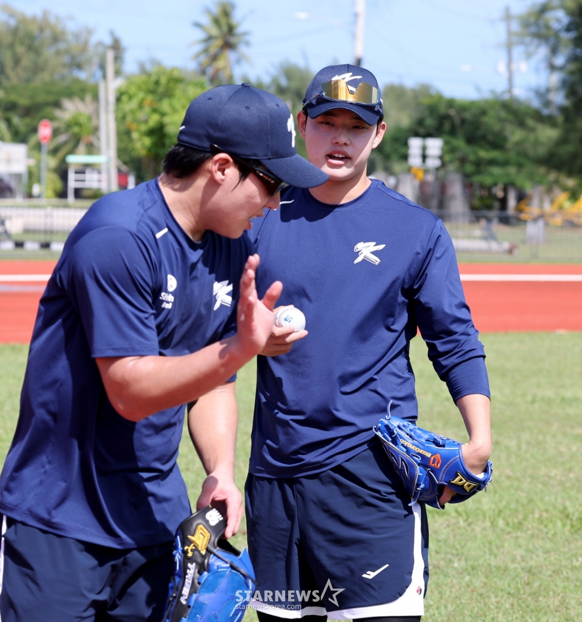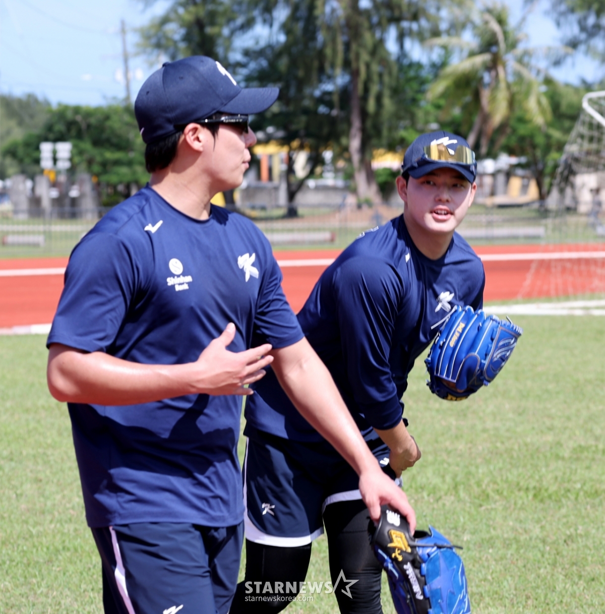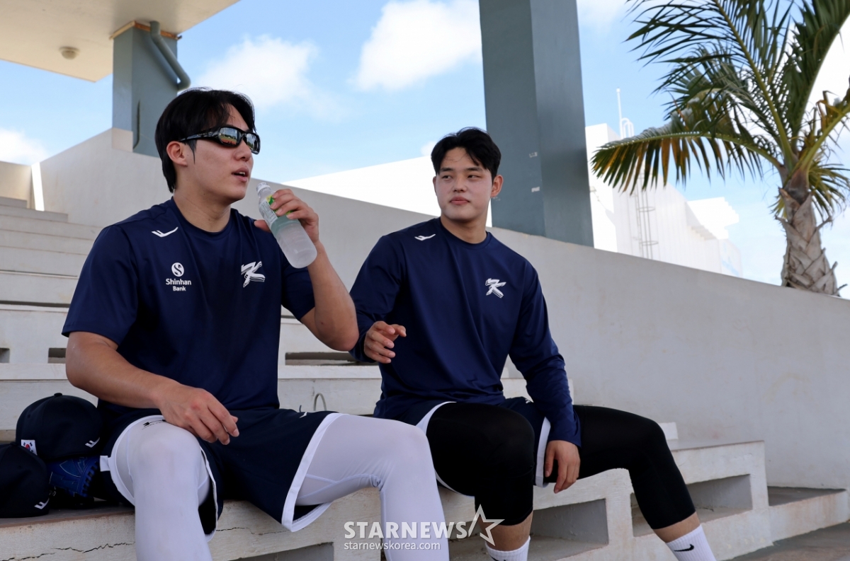 Moon Dong-ju and Won Tae-in of the national baseball team are talking while taking a short break during the morning training on the second day of the off-season training at the Oleye Sports Complex in Saipan on the 11th.