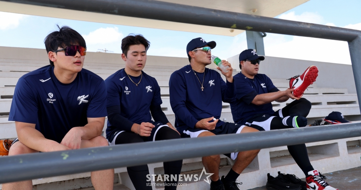 Baseball team closer Park Young-hyun and Cho Byung-hyun are taking a break next to Wang Go-cham Noh Kyung-eun and Ryu Hyun-jin during the morning training on the second day of the off-season training at the Oleye Sports Complex in Saipan on the 11th. 2026.01.11.