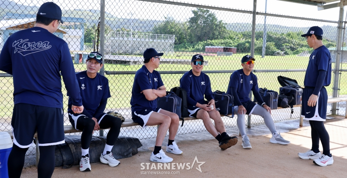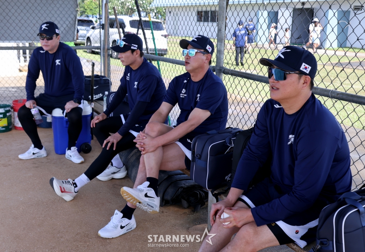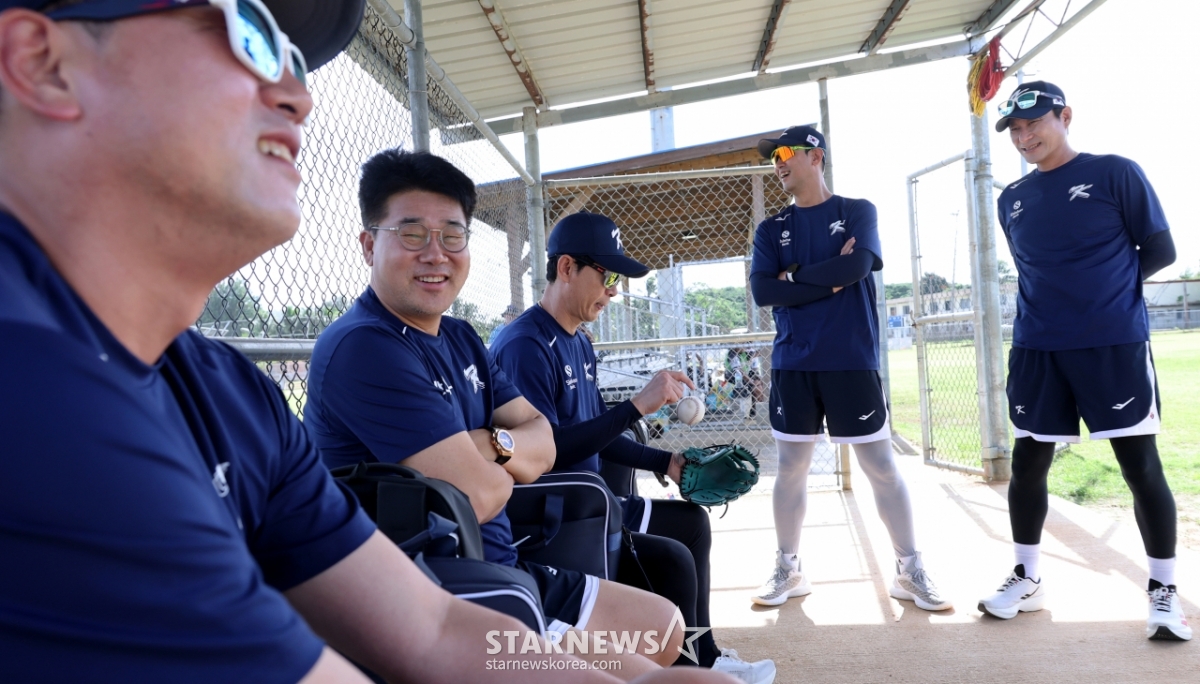 Kang In-kwon, the head coach of the national baseball team, is chatting with coaches Lee Dong-wook, Kim Kwang-sam, Lee Jin-young, Choi Won-ho and Kim Jae-gul, waiting for the start of off-season training at the Oleye Sports Complex in Saipan on the 12th. 2026.01.12.
