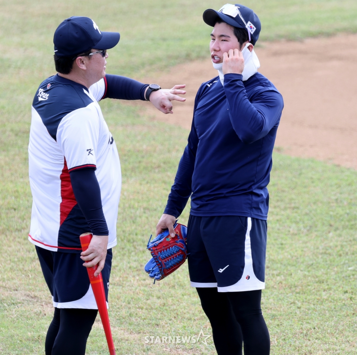 Coach Lee Dong-wook of the national baseball team talks with Kim Hye-sung after completing defensive training on the 5th day of training at the Oleye Sports Complex in Saipan on the 14th. 2026.01.14