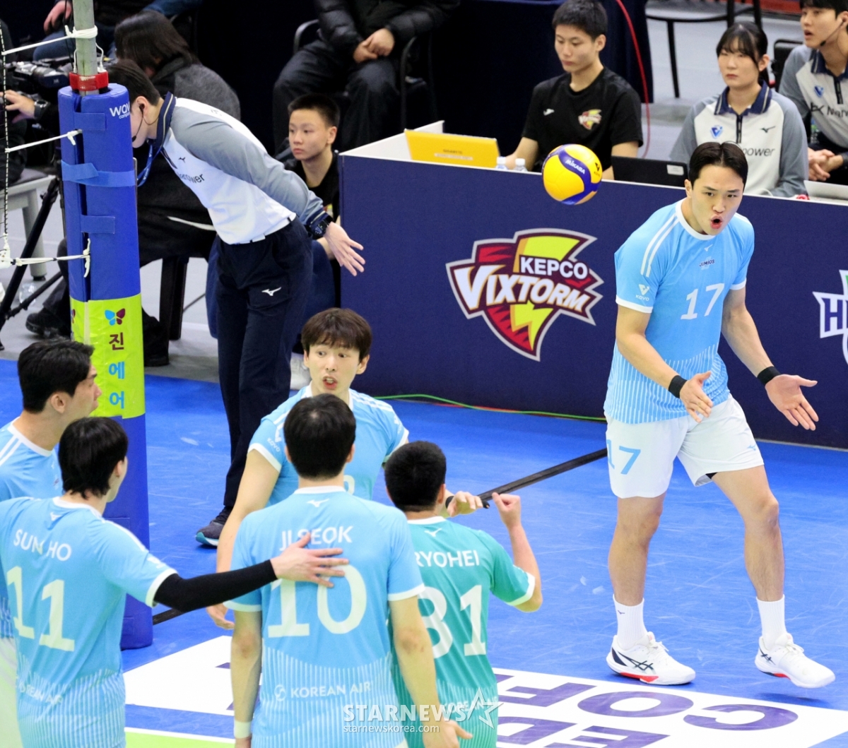 Korean Air's Lim Dong-hyuk cheers after scoring in the 2025-2026 Jin Air V-League match between KEPCO and Korean Air at Suwon Gymnasium on the 20th..202601.20.