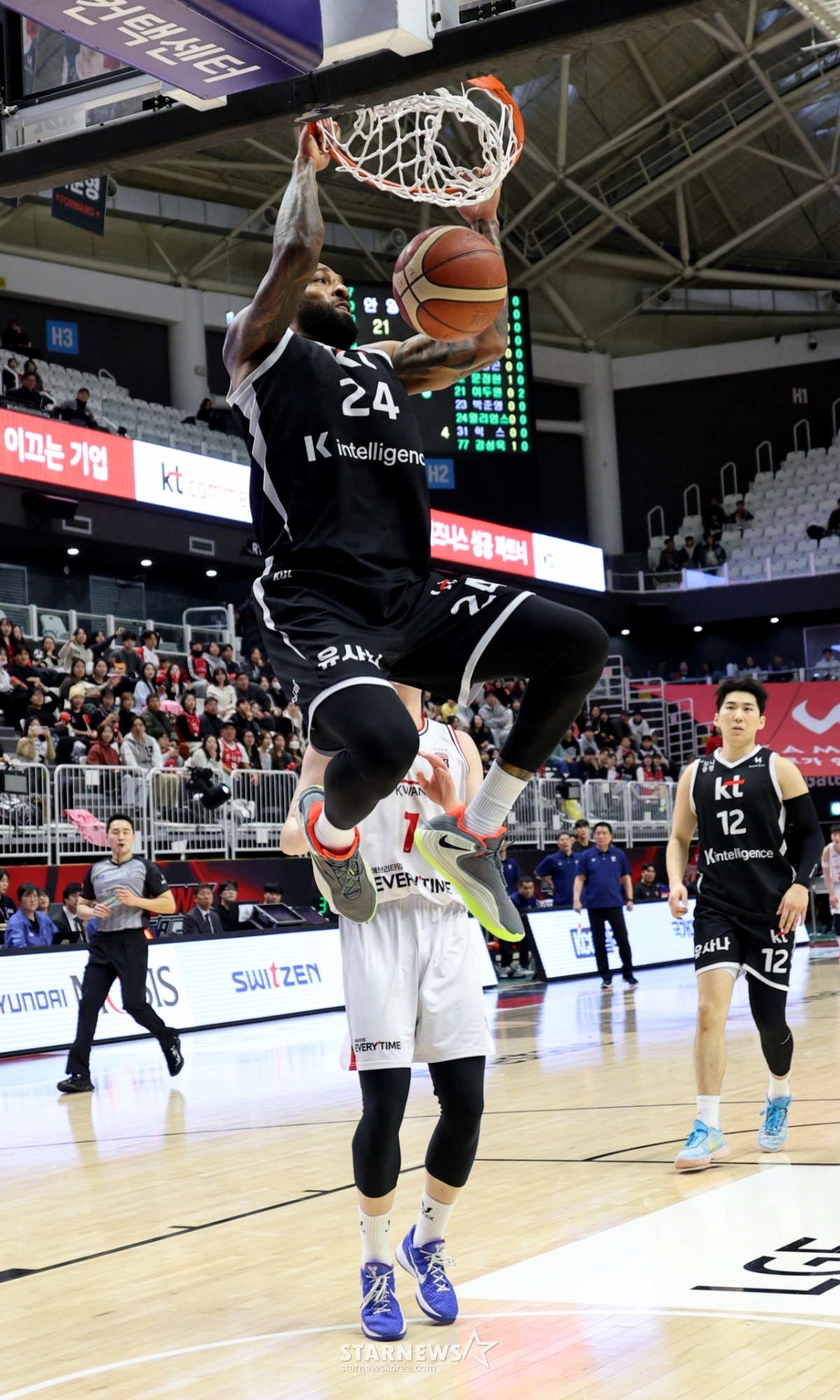 KT Williams hits a dunk in the first quarter of the 2025-2026 professional basketball game against KT at Suwon kt Sonic Boom Arena on the 21st.202601.21.
