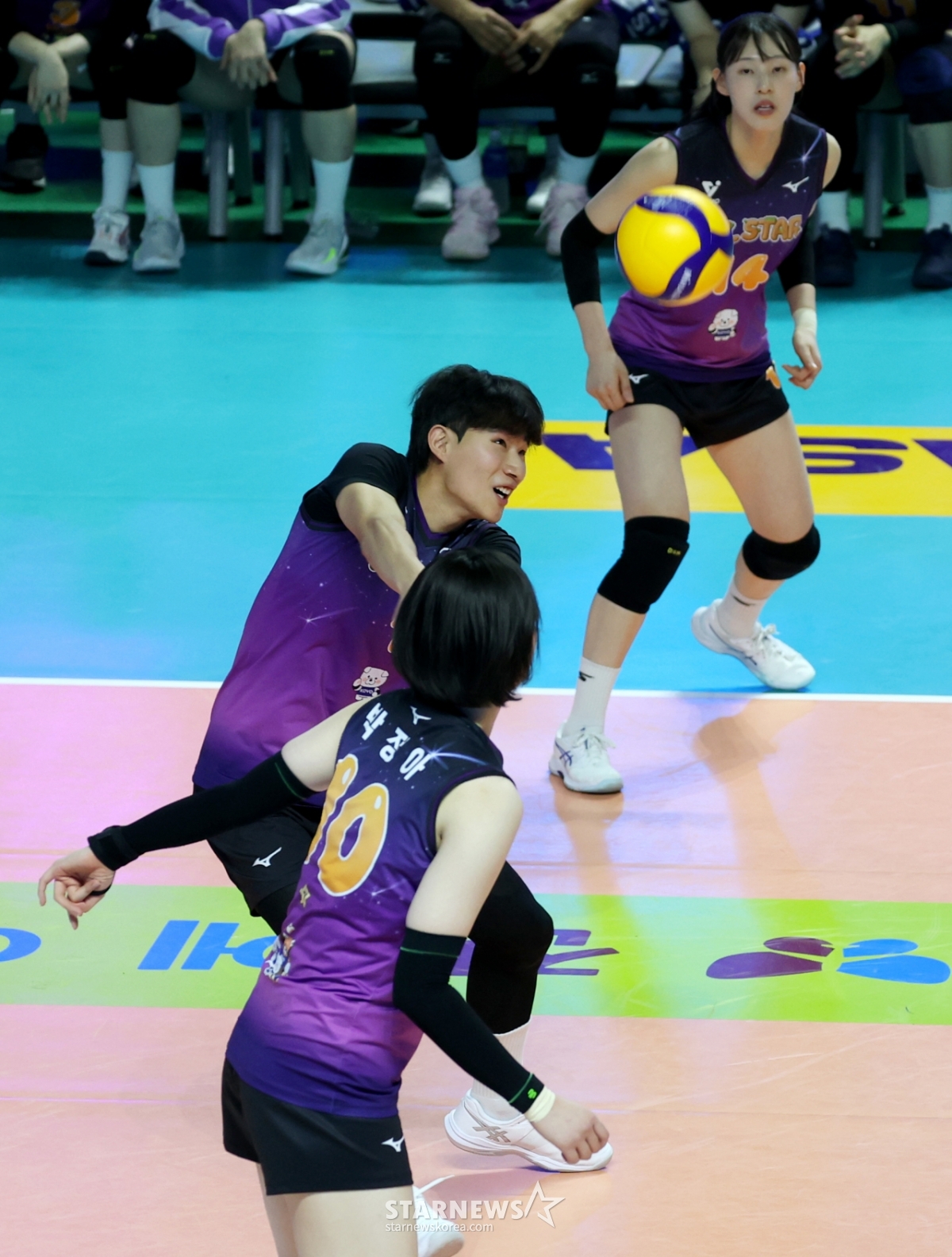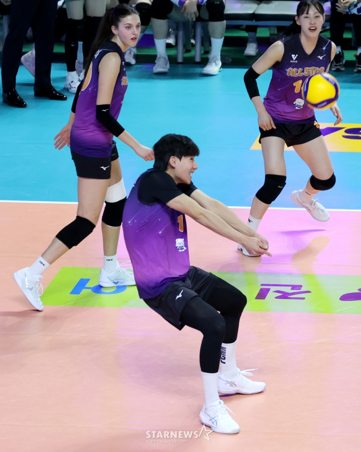 V-star Kim Woo-jin takes the mound and receives in the women's game in the second set of the 2025-2026 Jin Air V-League All-Star Game at Hoban Gymnasium in Chuncheon on the 25th. 2026. 01.25.