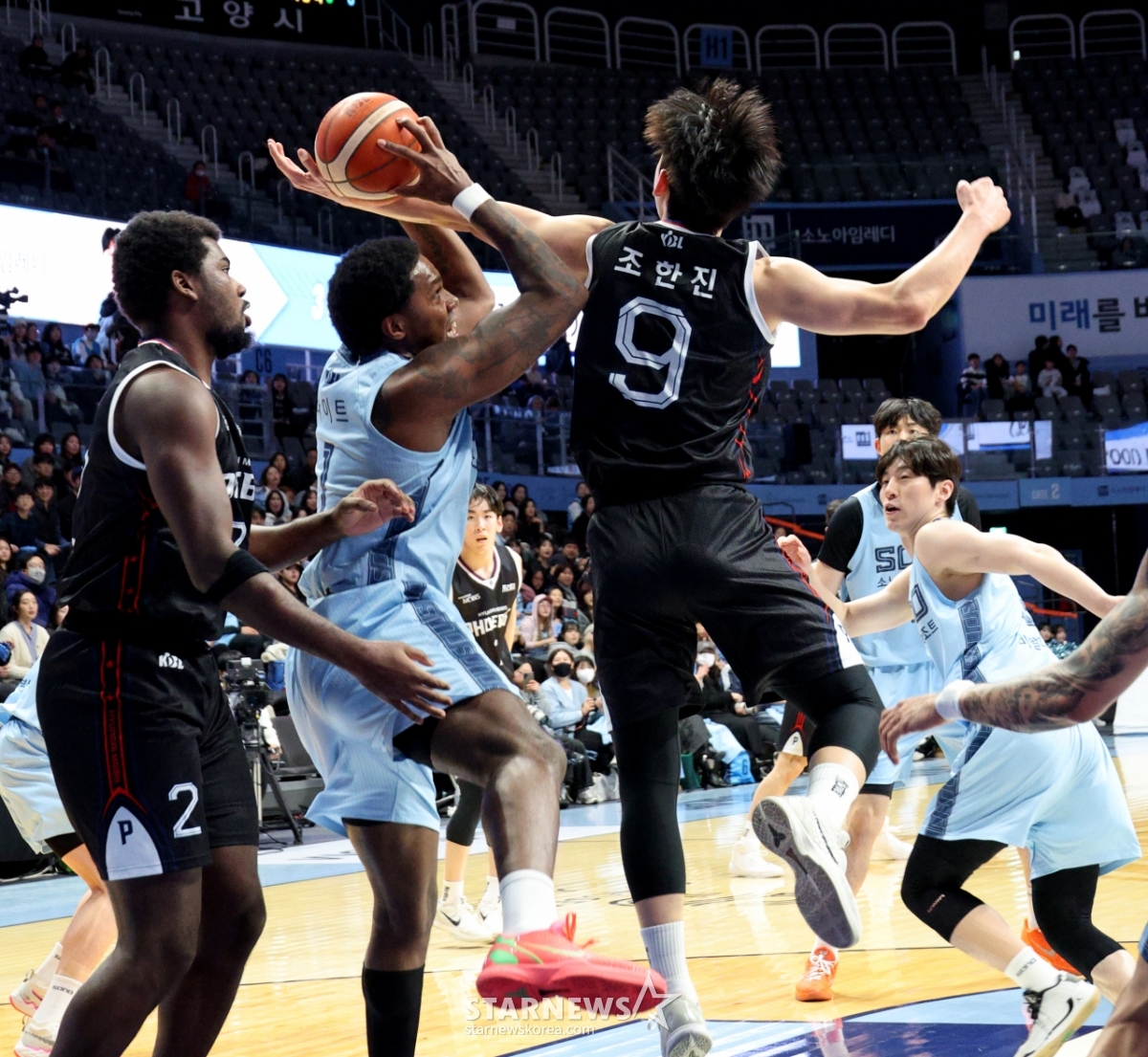 Ulsan Mobis' Cho Han-jin is committing a foul on the night in the 2025-2026 LG Electronics professional basketball match between Goyang Sono and Ulsan Mobis at Goyang Sono Arena on the 27th. 2026.01.27