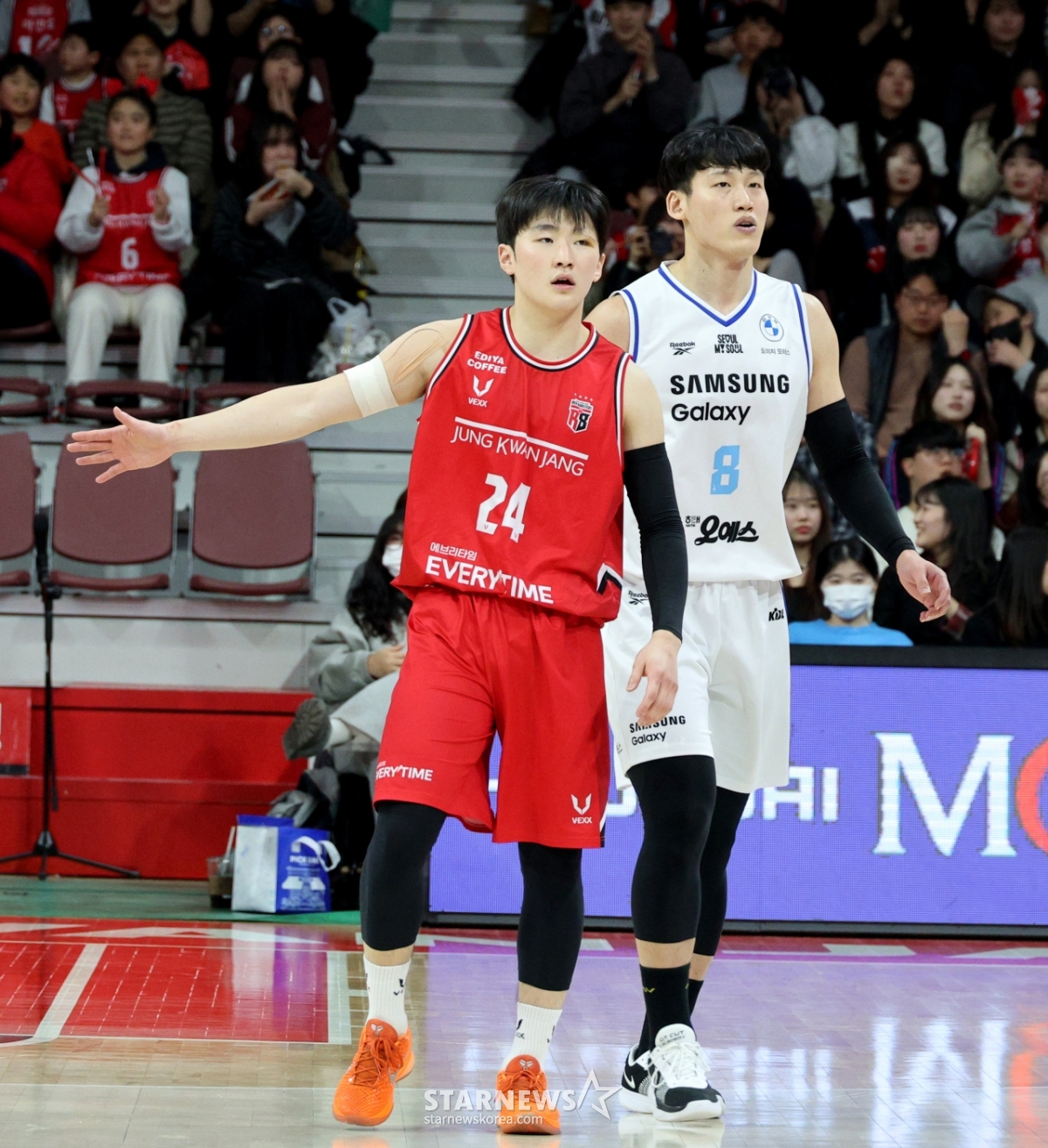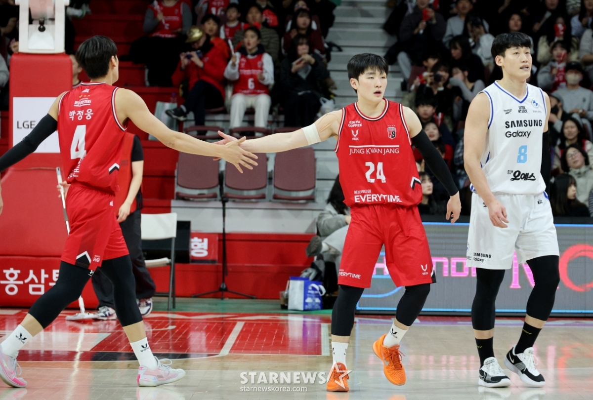 Jung Kwan-jang Moon Yoo-hyun is sharing a high five with Park Jung-woong in the 2025-2026 LG Electronics professional basketball match between Jung Kwan-jang and Samsung at Anyang Gymnasium on the 29th. 2026.01.29.