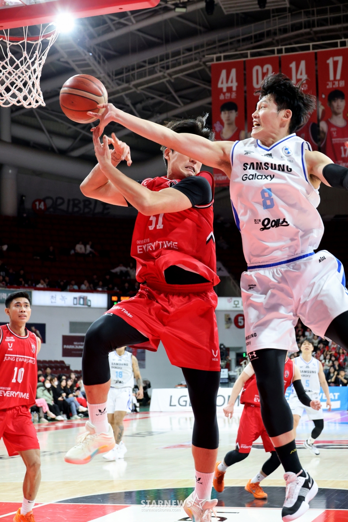 Samsung's Choi Hyun-min is competing for a rebound with Han Seung-hee in the 2025-2026 LG Electronics professional basketball match between Jung Kwan-jang and Samsung at Anyang Gymnasium on the 29th. 2026.01.29.