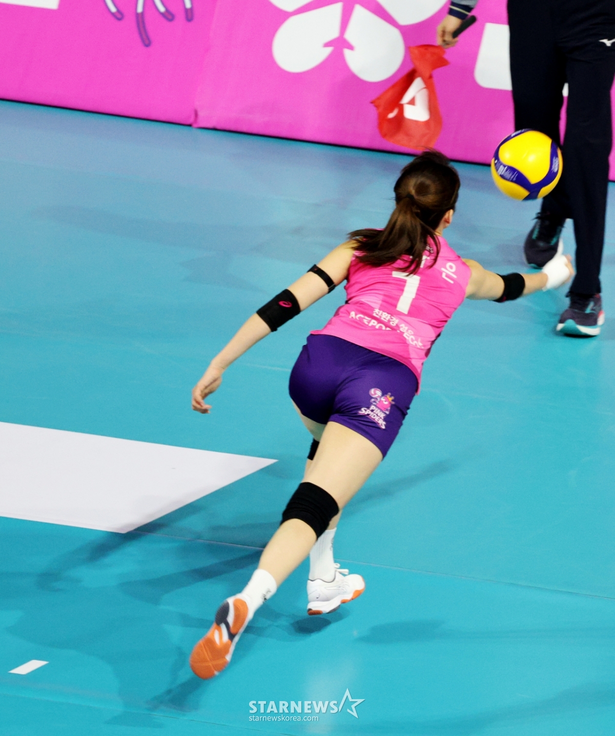 Heungkuk Kim Dae-eun saves the ball that is out of the V-League Heungkuk Life Insurance and Pepper Savings Bank game in the 2025-2026 camp at Samsan World Gymnasium on the 1st. 2026.02.01.