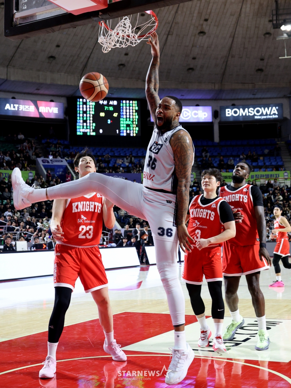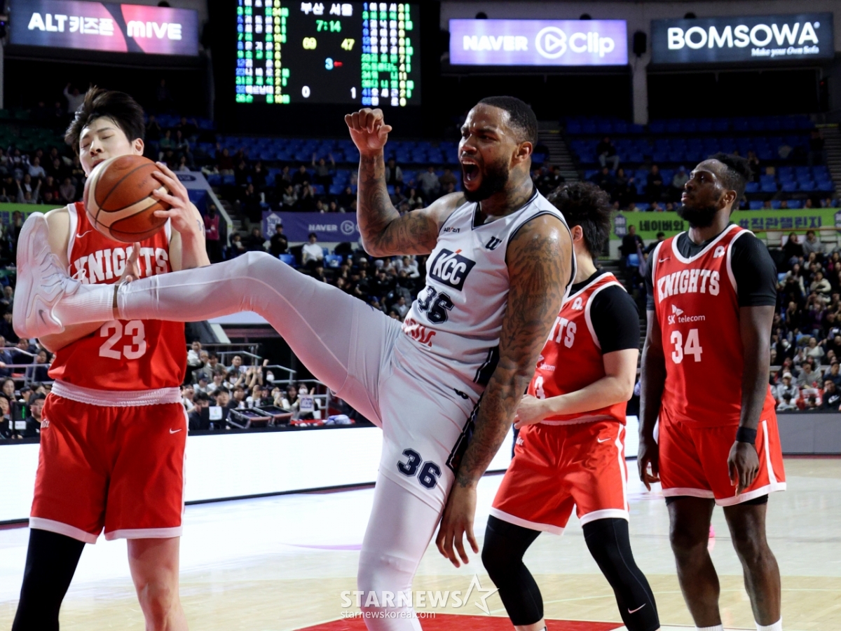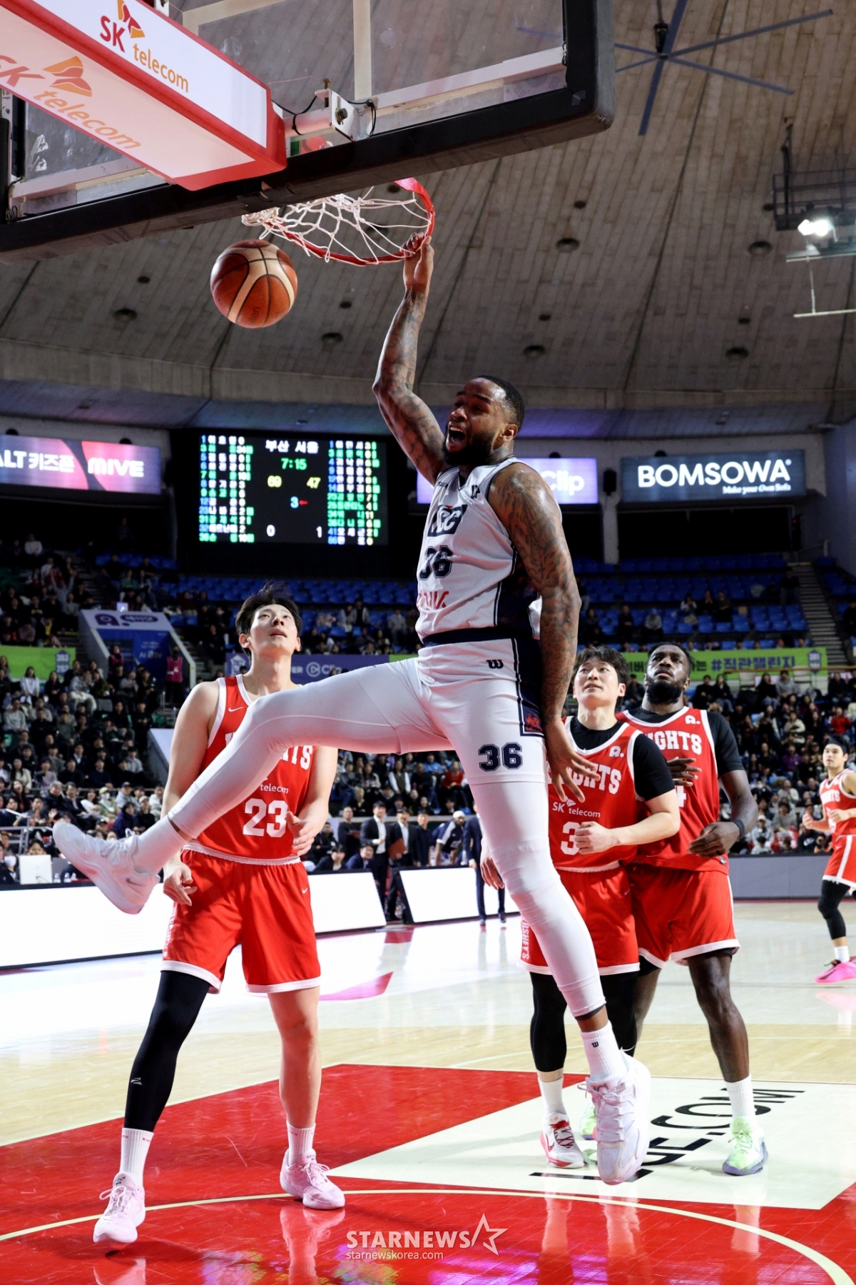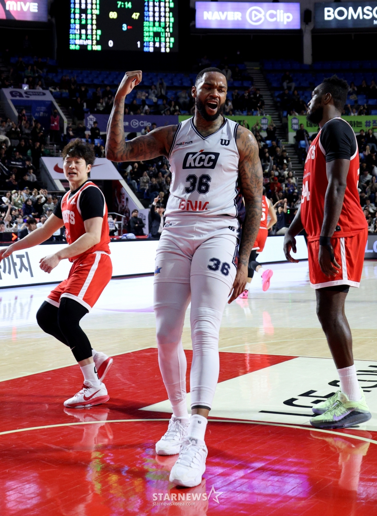 KCC Shaunlong cheers after making a dunk in the 2025-2026 LG Electronics professional basketball match between Seoul SK and Busan KCCC at the Silhak Sports Center on the 2nd. 2026.02.02.