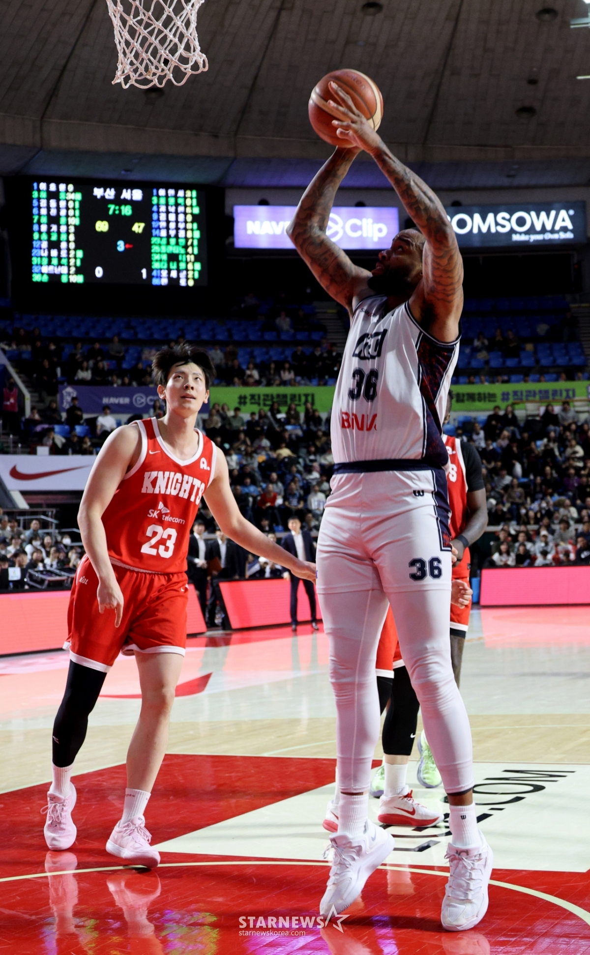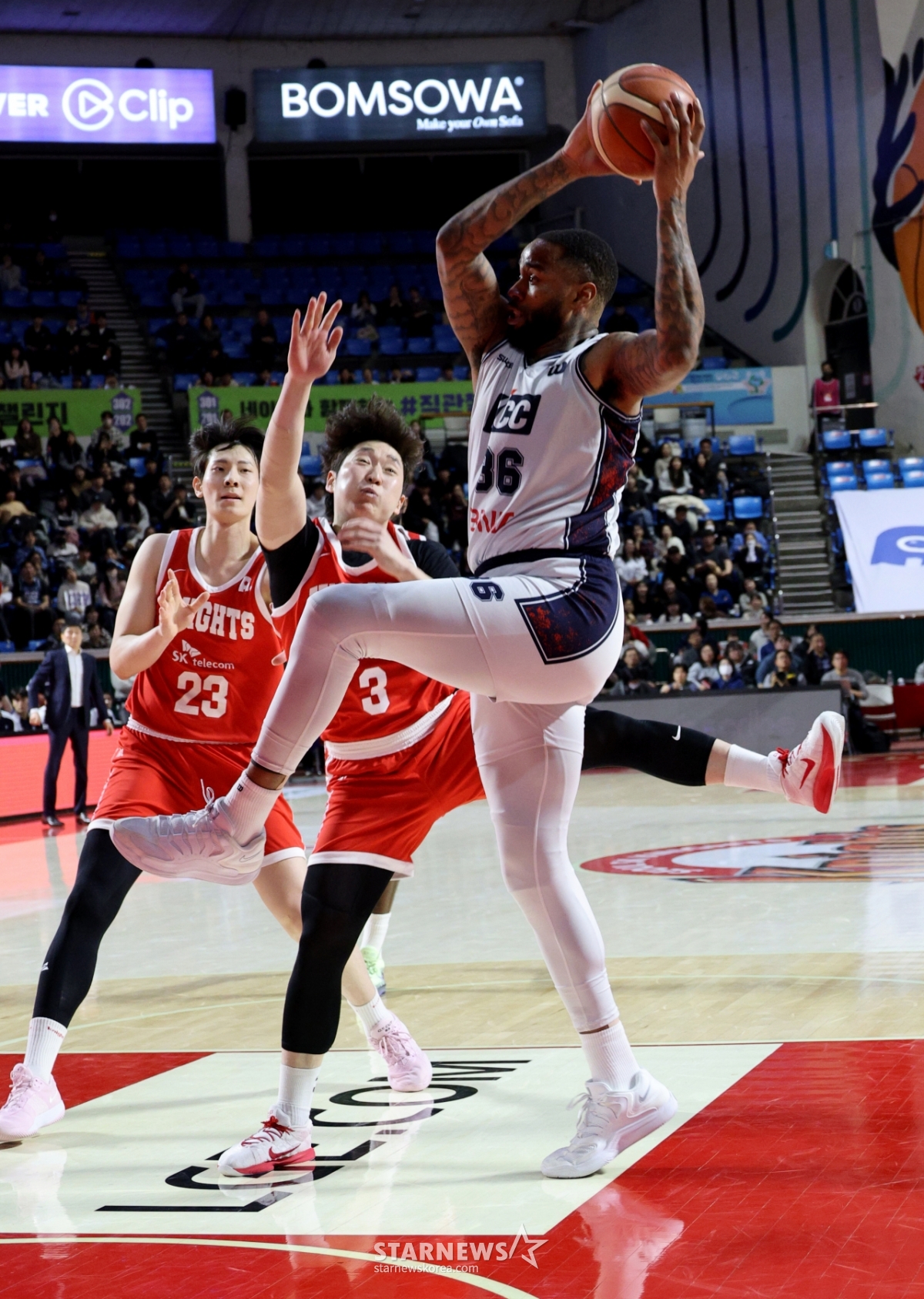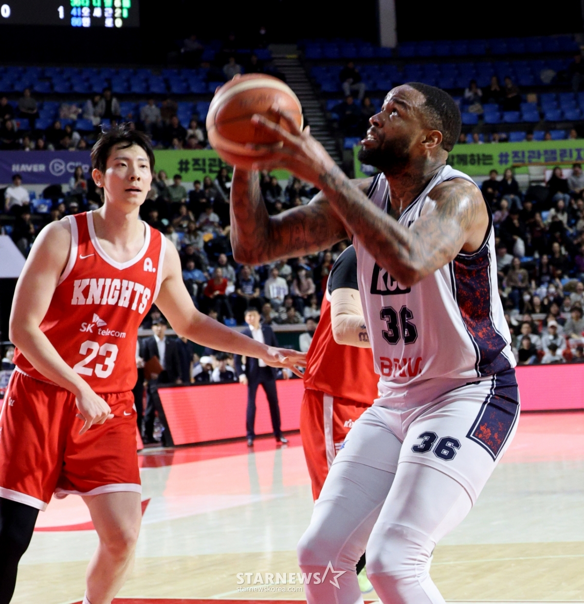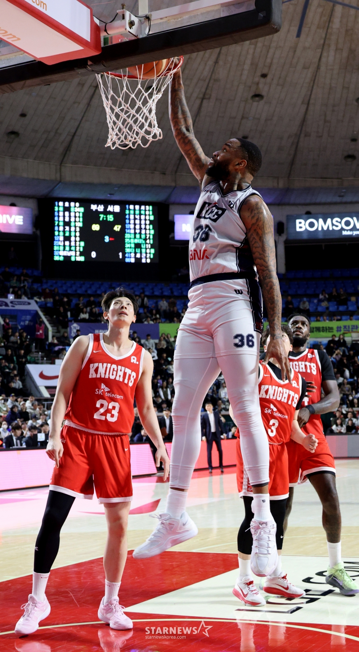 KCC Shaunlong cheers after making a dunk in the 2025-2026 LG Electronics professional basketball match between Seoul SK and Busan KCCC at the Silhak Sports Center on the 2nd. 2026.02.02.