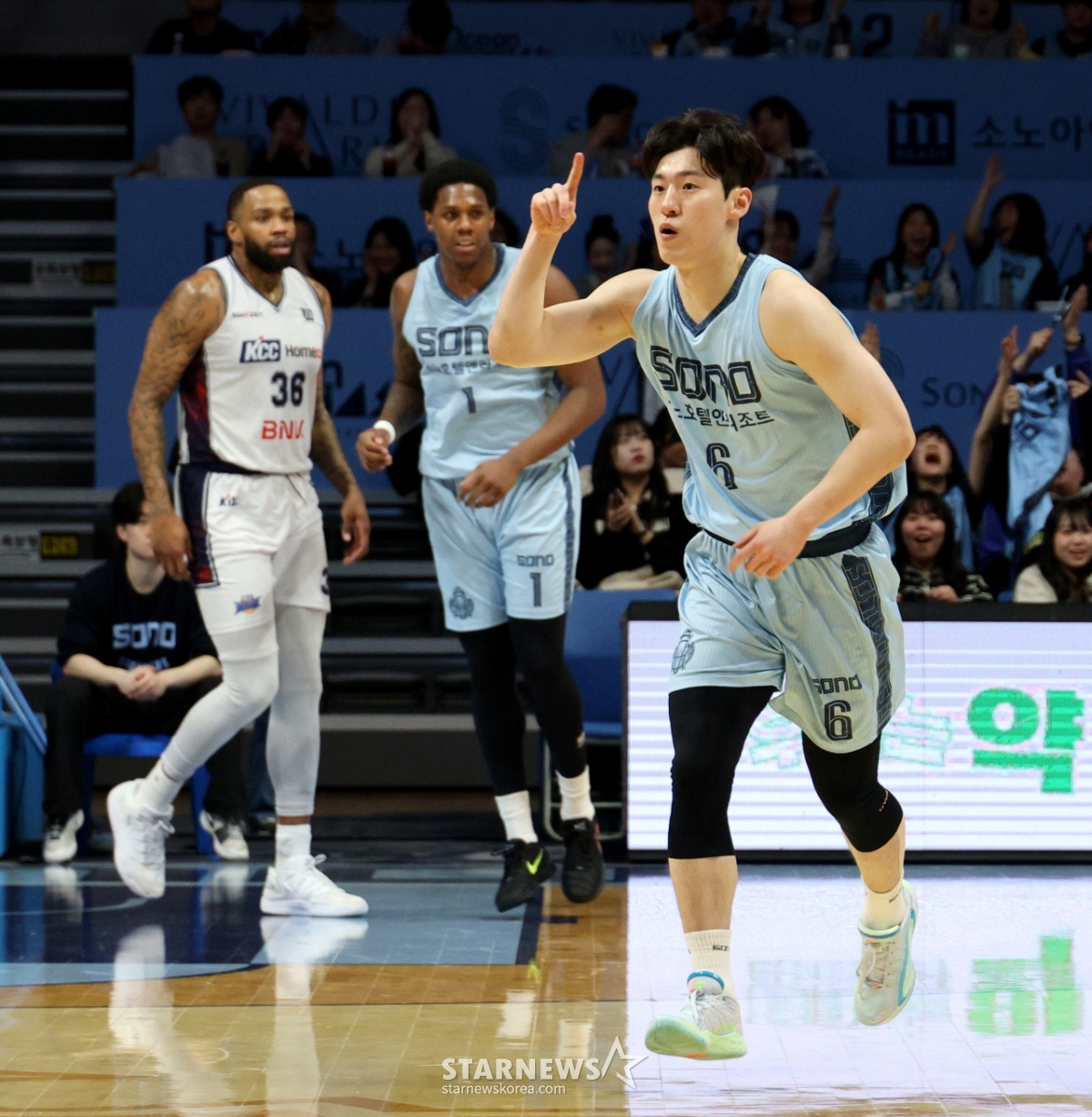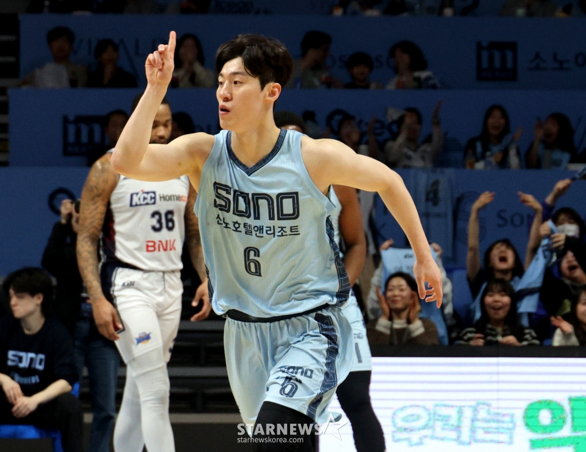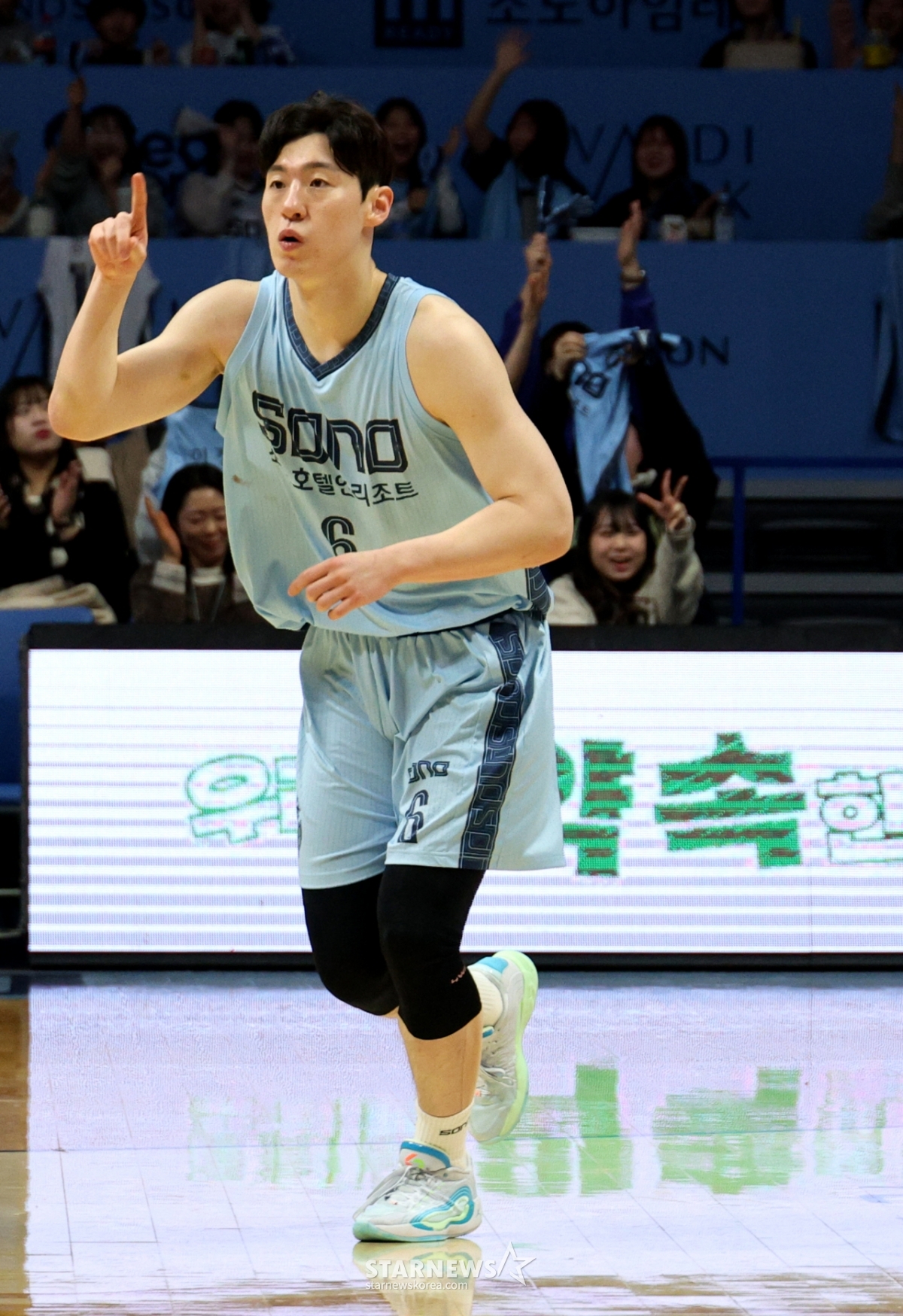 Sono Lee Jung-hyun celebrates after making a three-point shot in the 2025-2026 LG Electronics professional basketball match between Goyang Sono and Busan KCC at Goyang Sono Arena on the 4th. 2026.02.04.