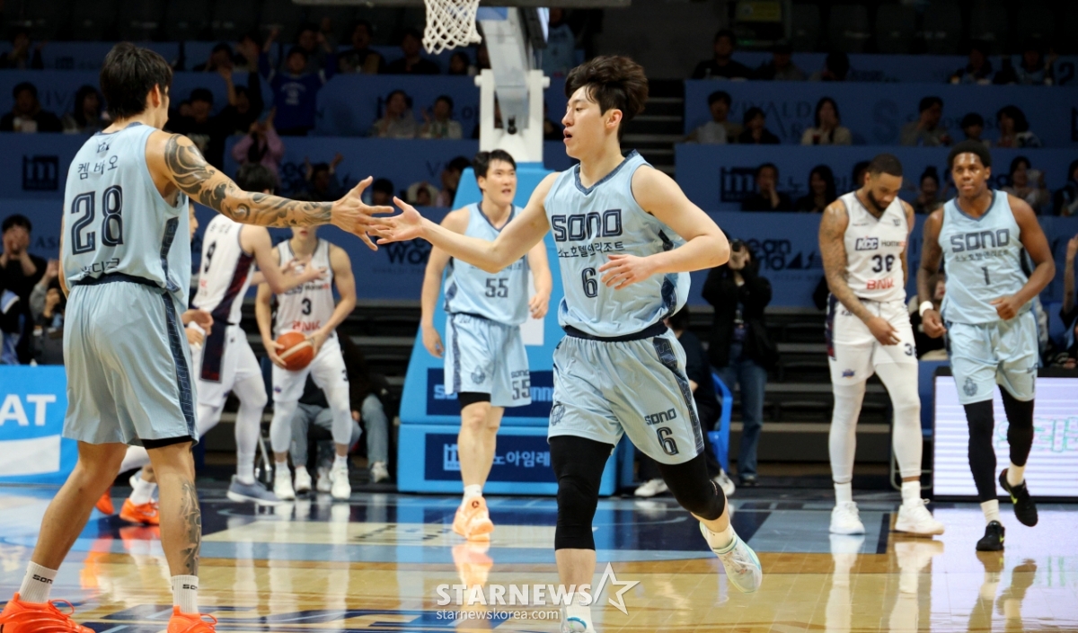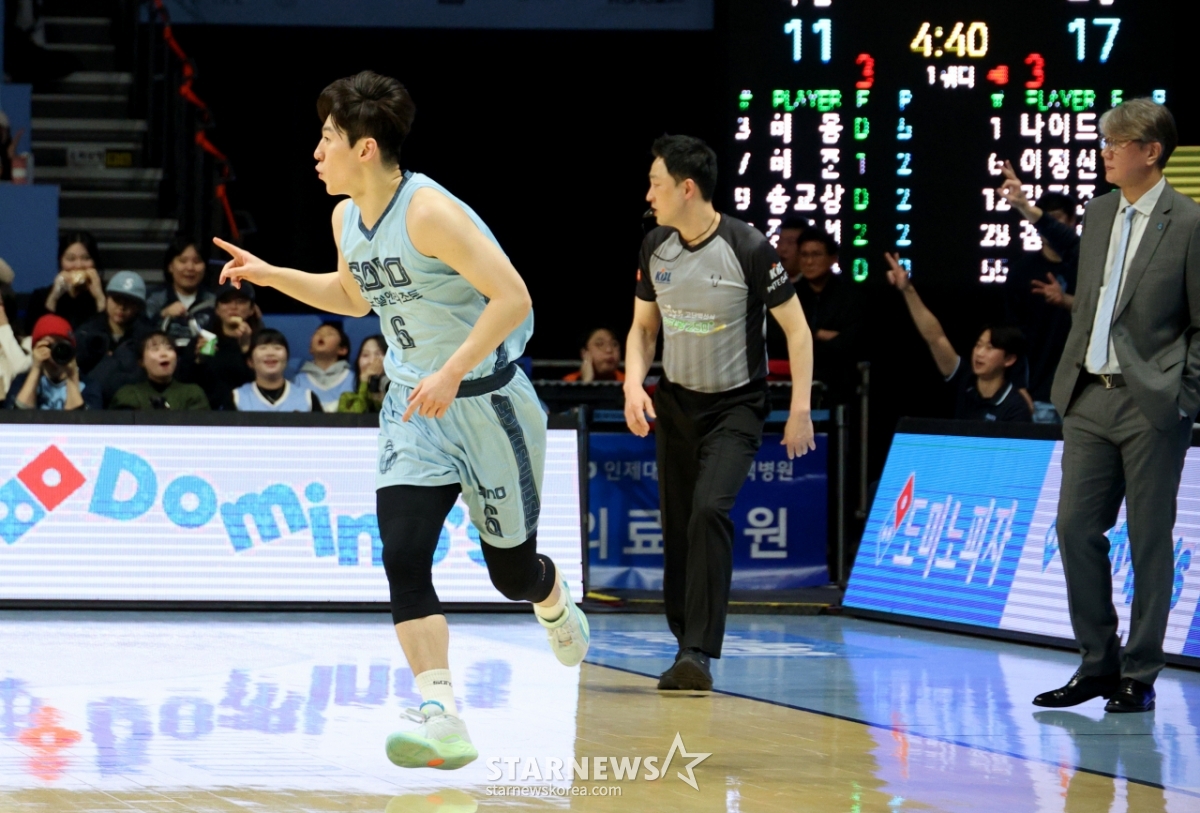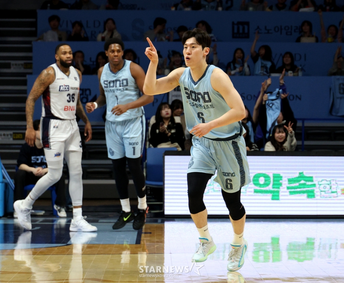 Sono Lee Jung-hyun celebrates after making a three-point shot in the 2025-2026 LG Electronics professional basketball match between Goyang Sono and Busan KCC at Goyang Sono Arena on the 4th. 2026.02.04.