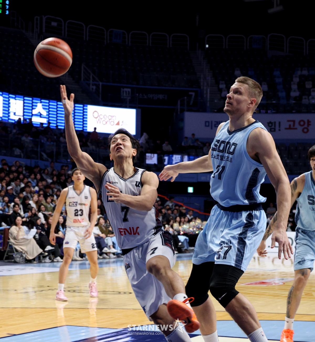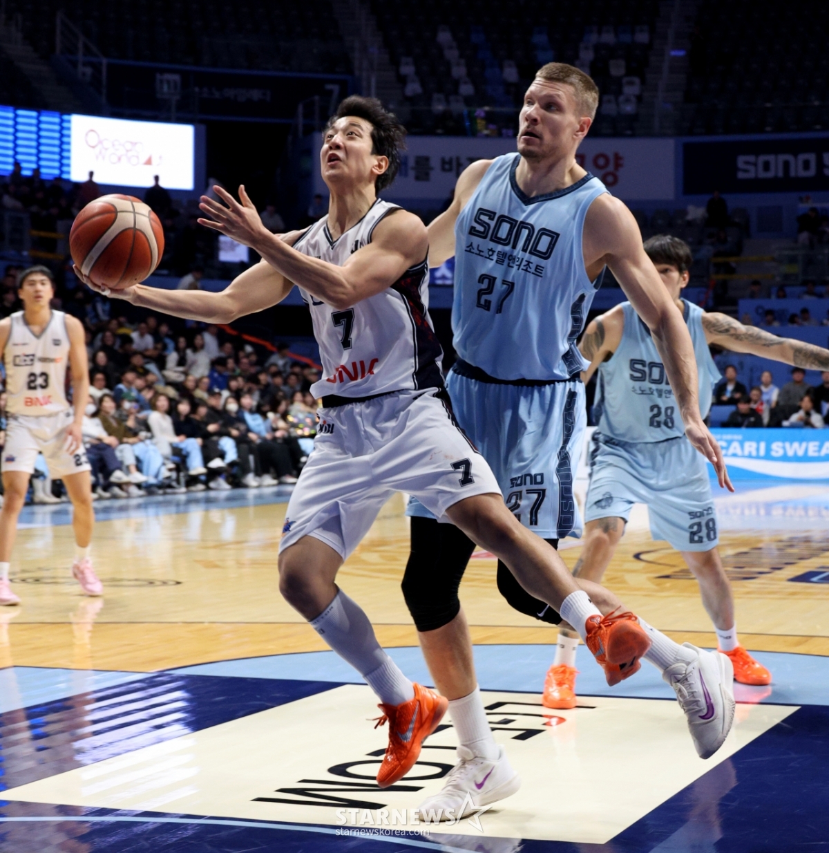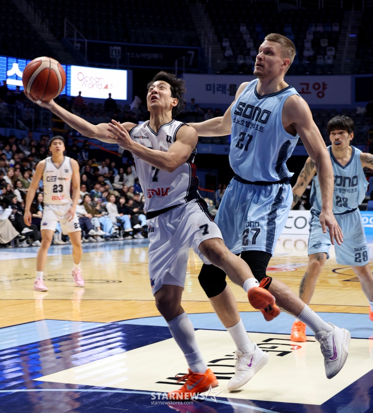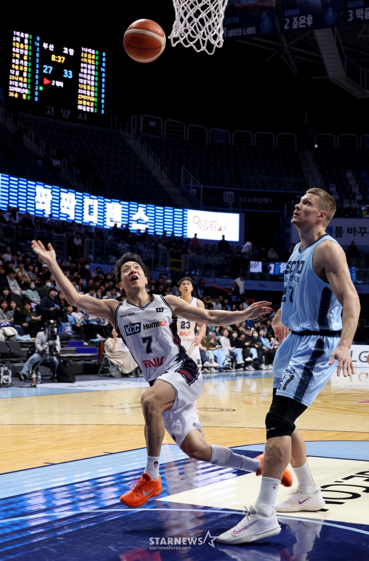 KCC Huh Hoon is trying to shoot despite a foul by Motsuka Vichus in the 2025-2026 LG Electronics professional basketball match between Goyang Sono and Busan KCC at Goyang Sono Arena on the 4th. 2026.02.04.
