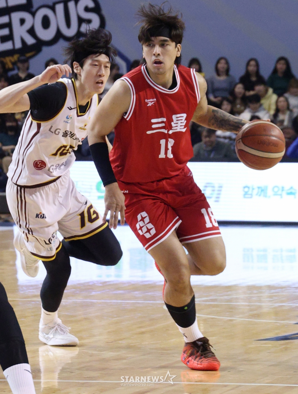 Samsung's Gutang is penetrating under the basket, beating LG's Jeong In-deok.