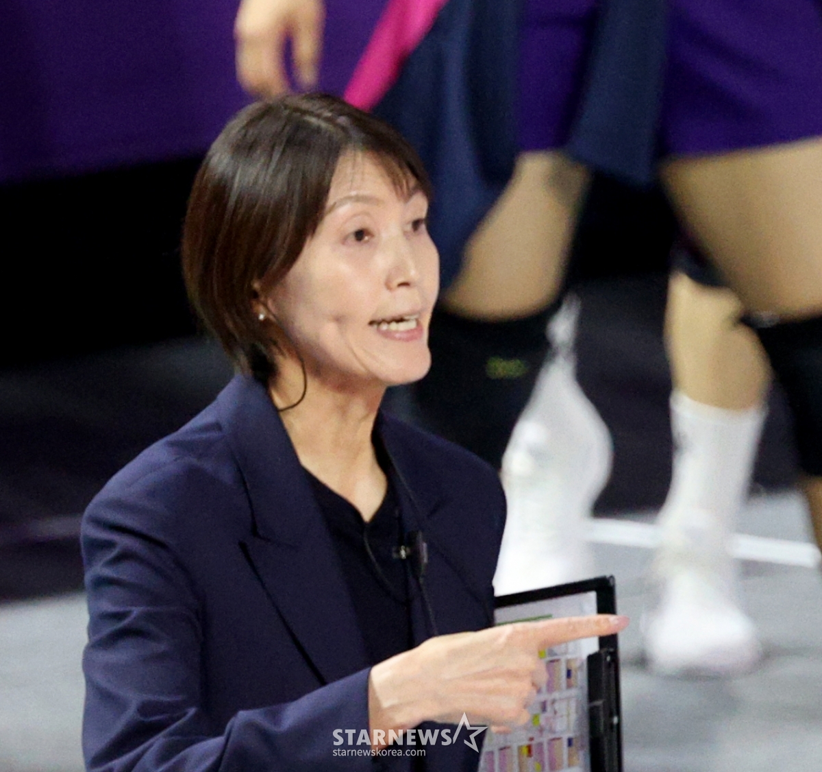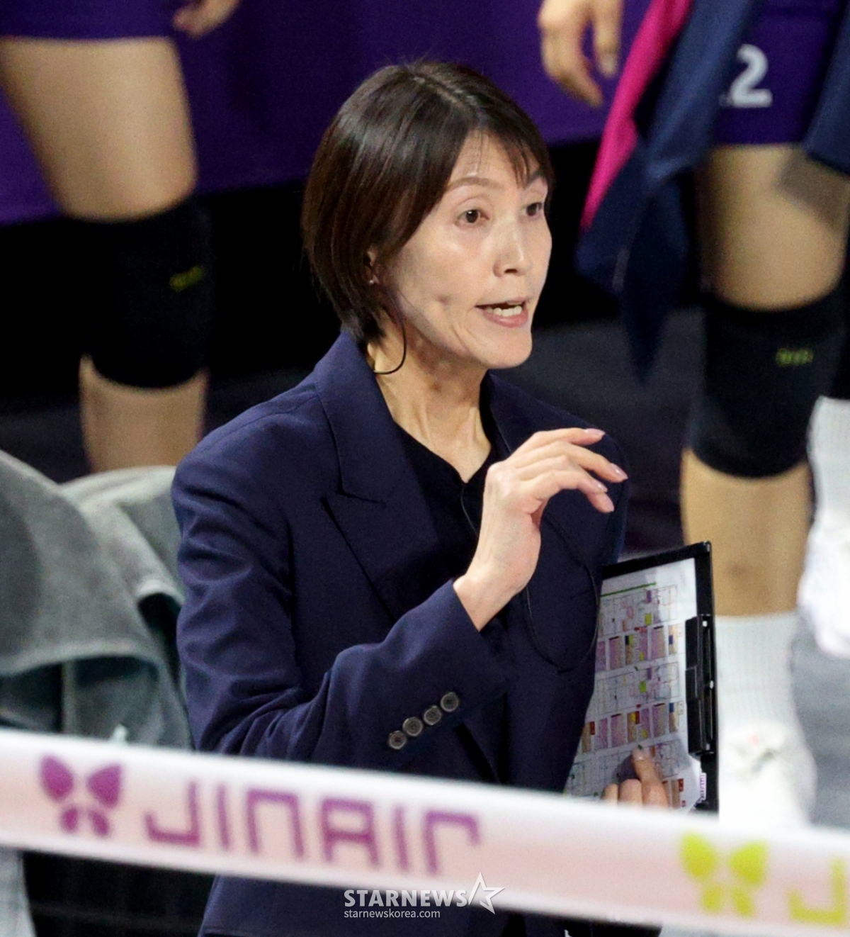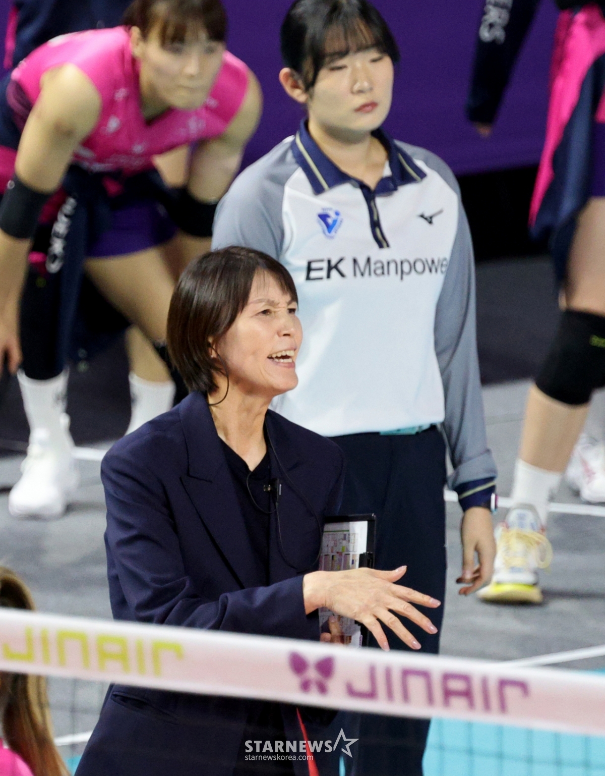 Heungkuk Yoshihara Tomoko is instructing the players to operate in the 2025-2026 Jin Air V-League Women's Heungkuk Life Insurance and Industrial Bank of Korea match held at Samsan World Gymnasium on the 6th. 2026.02.06.