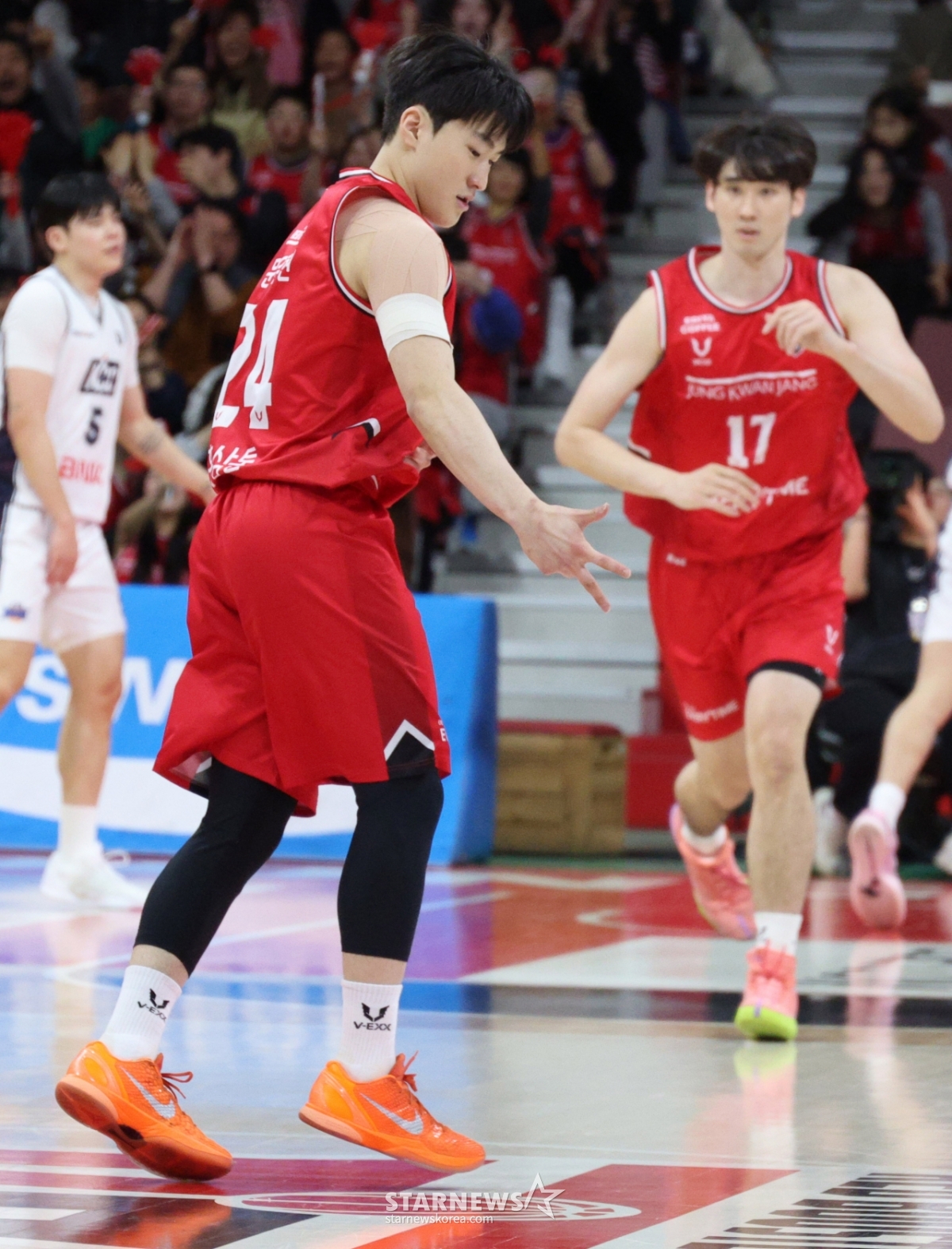 Jung Kwan-jang Moon Yoo-hyun is celebrating after a successful 3-point shot.