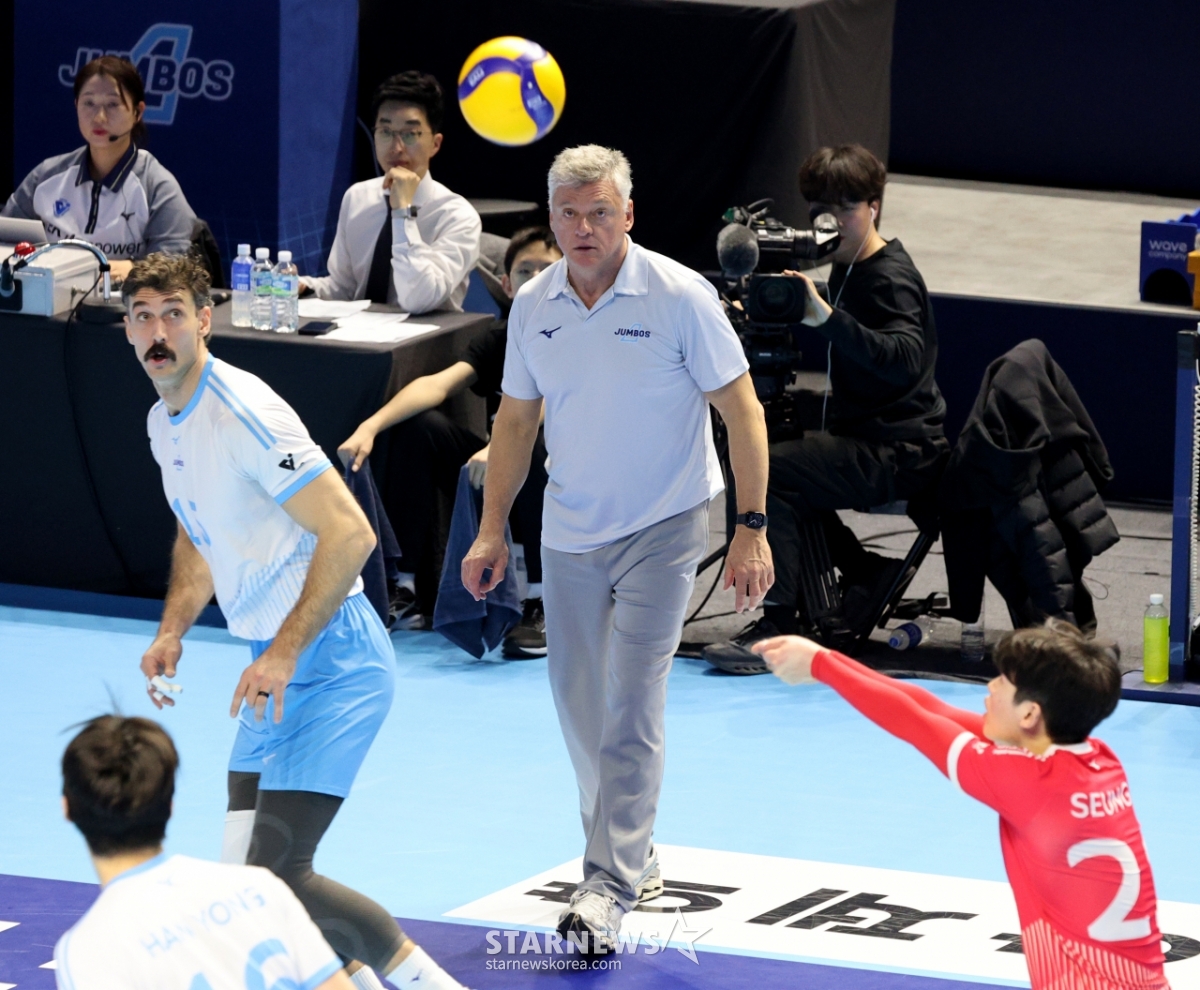Korean Air coach Henan cheers in a match between Korean Air and KEPCO in the men's 2025-2026 Jin Air V-League at Gyeyang Gymnasium on the 7th. 2026.02.07.