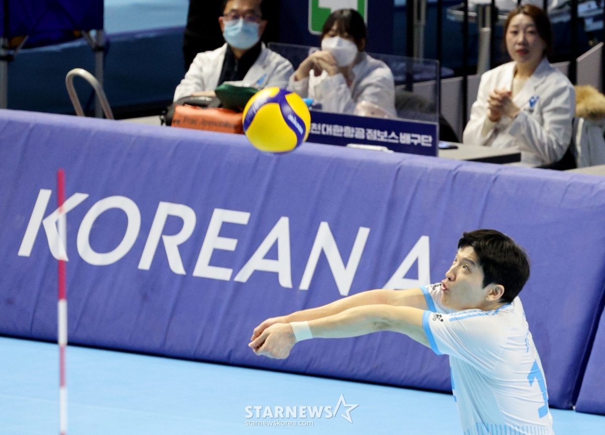 Korean Air's Jung Ji-seok is trying to receive a reception in the men's 2025-2026 Jin Air V-League match between Korean Air and KEPCO at Gyeyang Gymnasium on the 7th. 2026.02.07.