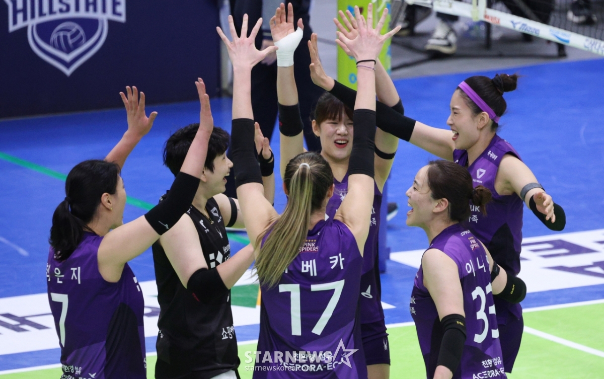 Heungkuk Life's Kim Soo-ji is delighted with her colleagues after succeeding in a decisive blocking.