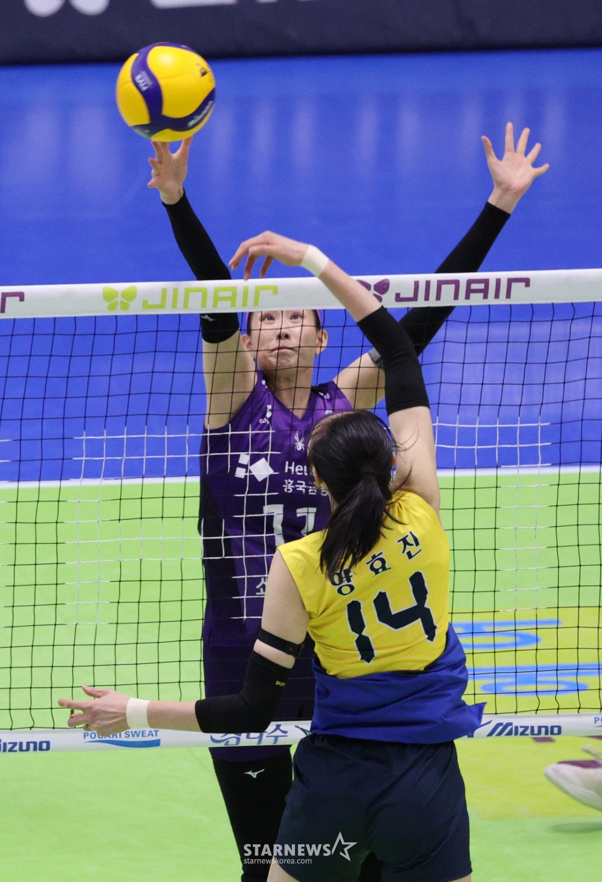 Hyundai Engineering & Construction's Yang Hyo-jin is hitting back-to-back hits to avoid Heungkuk Life's Kim Soo-ji's block.