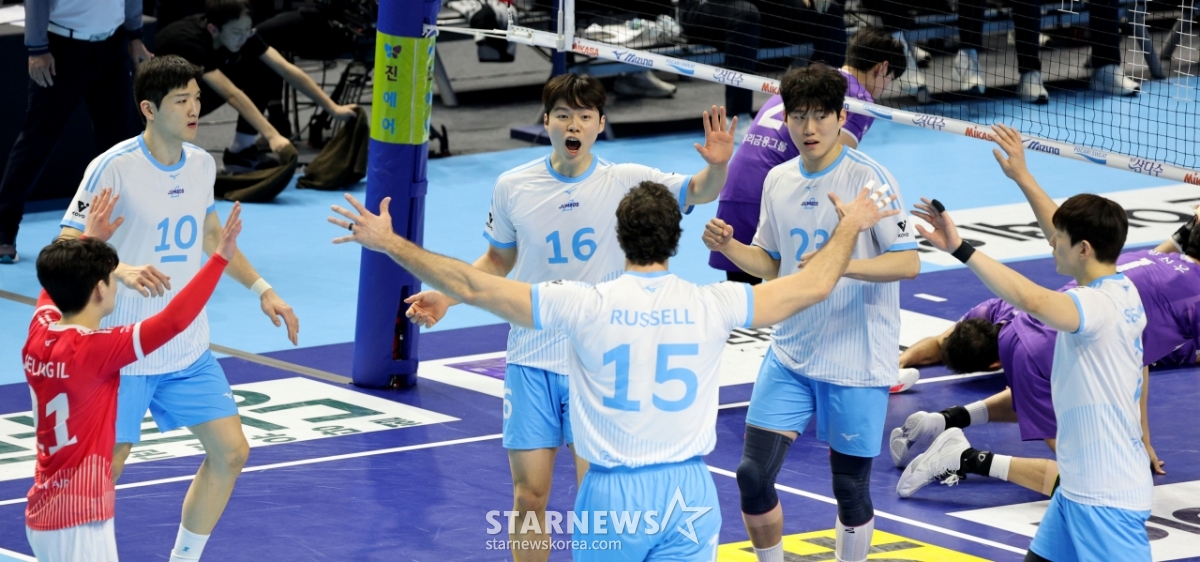 Korean Air players celebrate after scoring in a match between Korean Air and Woori Card in the Jin Air 2025-2026V League at Gyeyang Gymnasium on the 10th. 2026.02.10.