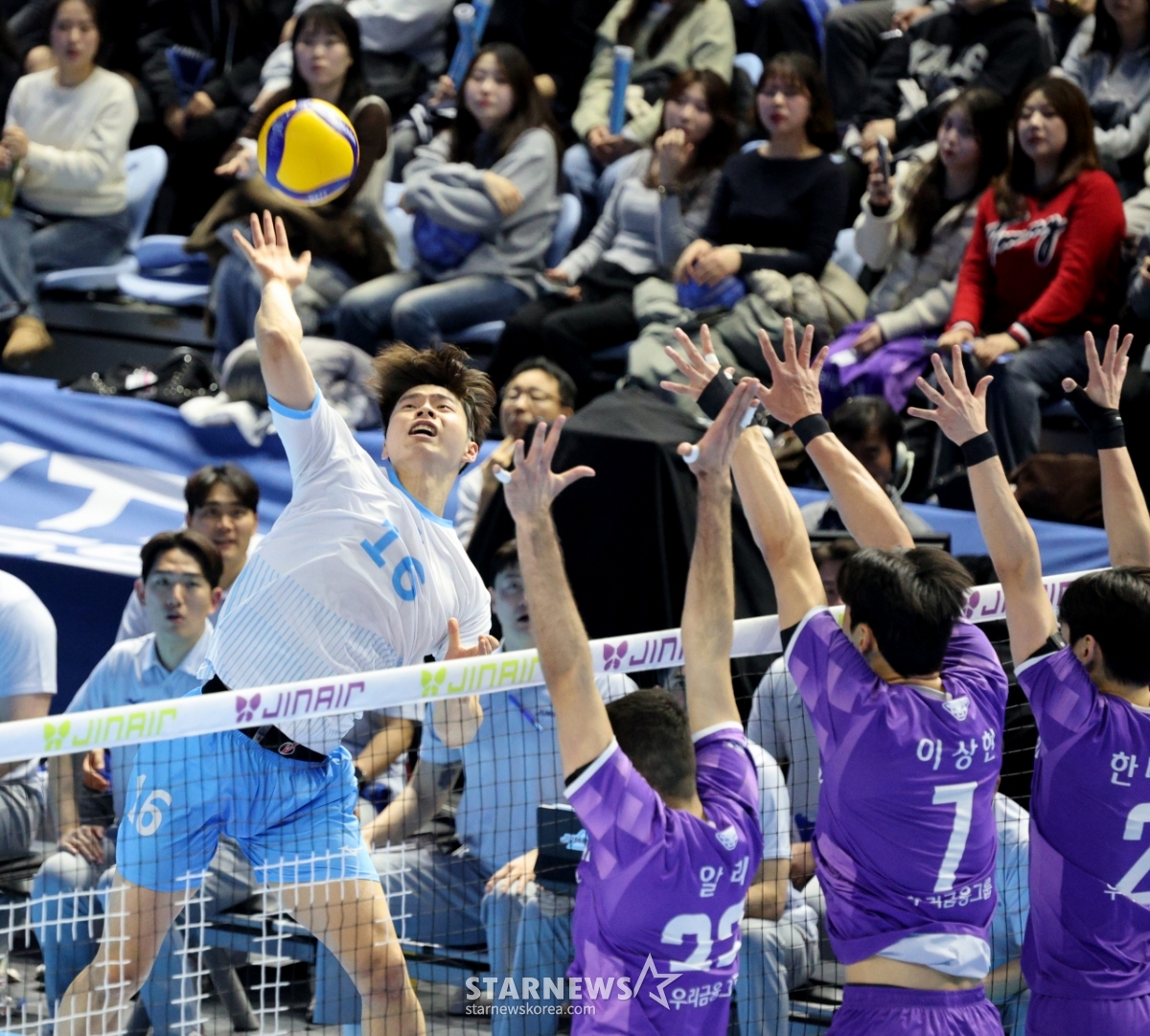 Korean Air's Jeong Han-yong is trying to hit our triple blocking in a match between Korean Air and Woori Card in the Jin Air 2025-2026V League at Gyeyang Gymnasium on the 10th. 2026.02.10.