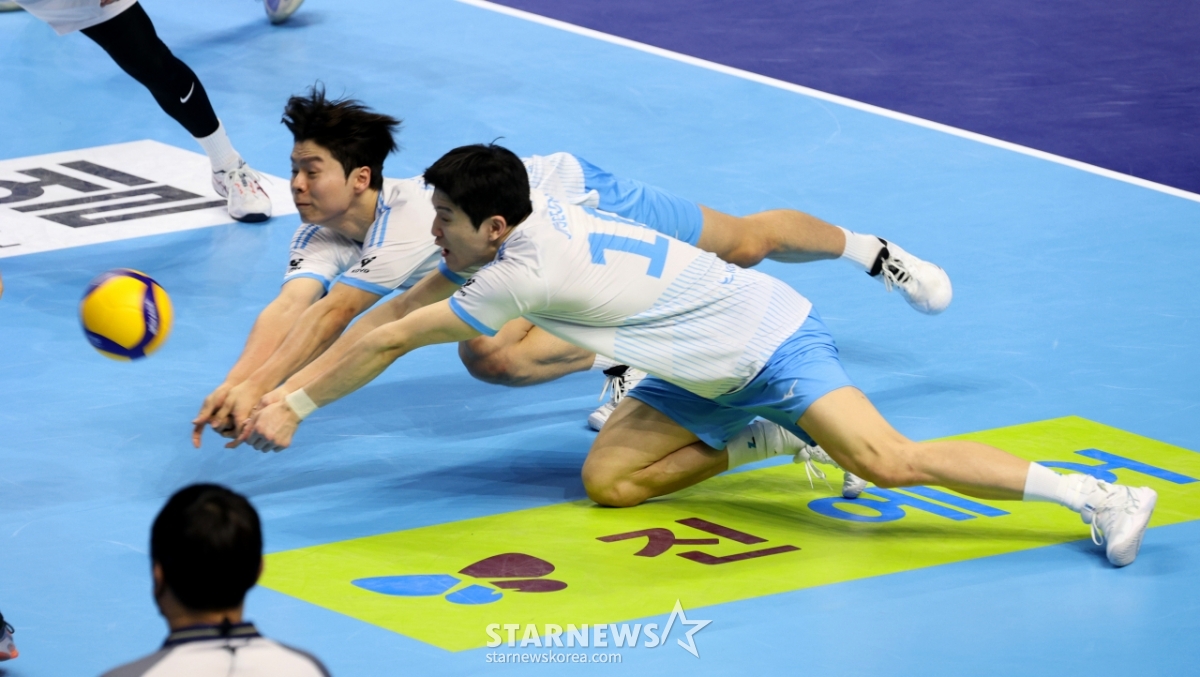 Korean Air's Jeong Han-yong and Jung Ji-seok are reviving the ball by flying themselves in a match between Korean Air and Woori Card in the Jin Air 2025-2026 V League held at Gyeyang Gymnasium on the 10th. 2026.02.10.