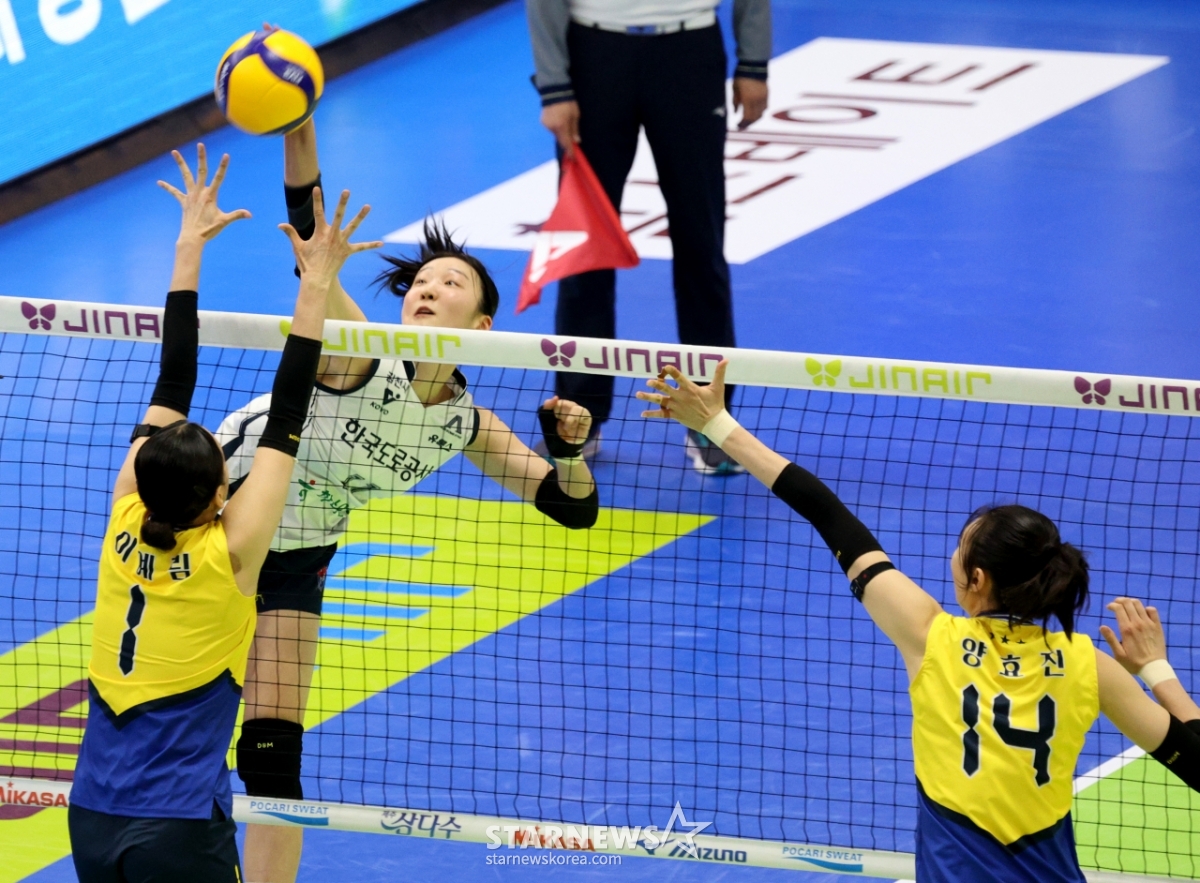 Kim Se-bin of the Korea Expressway Corporation hits Hyundai double blocking in the 2025-2026 Jin Air V-League match between Hyundai Engineering & Construction and Korea Expressway Corporation at Suwon Gymnasium on the 13th.. 2026.02.13.