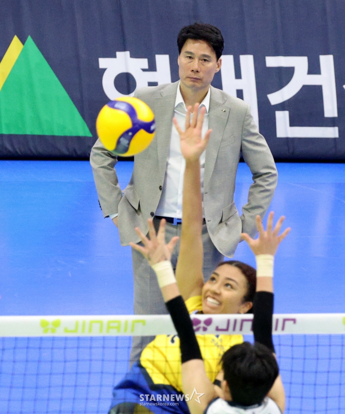 Hyundai manager Kang Sung-hyung is watching Jastis' attack in the 2025-2026 Jin Air V-League match between Hyundai Engineering & Construction and Korea Expressway Corporation at Suwon Gymnasium on the 13th.. 2026.02.13.