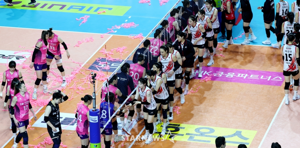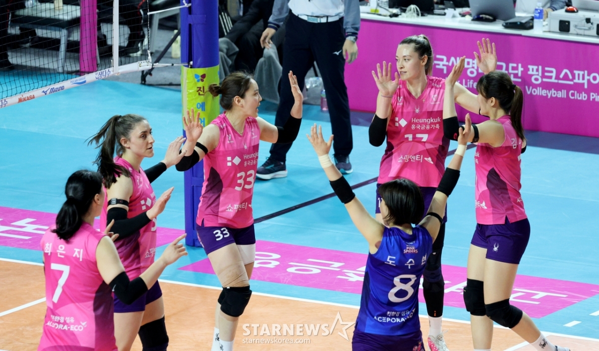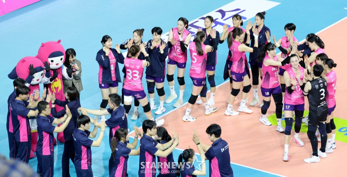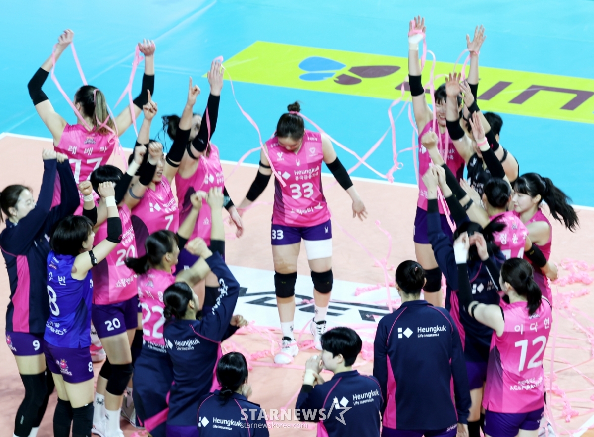 Heungkuk Life Insurance players celebrate after winning the 2025-2026 Jin Air V-League match against Heungkuk Life Insurance 3-0 at Samsan World Gymnasium on the 14th.